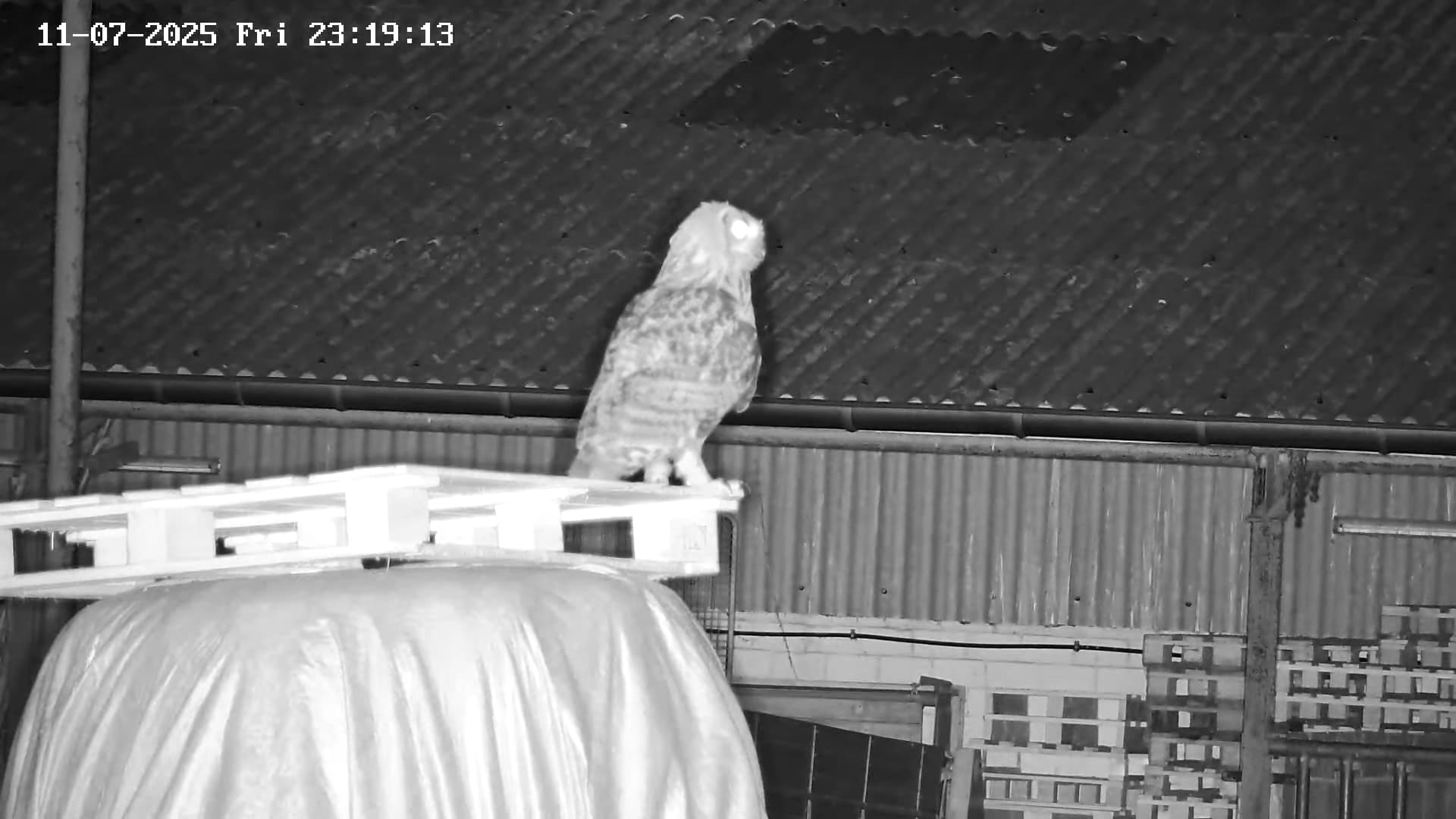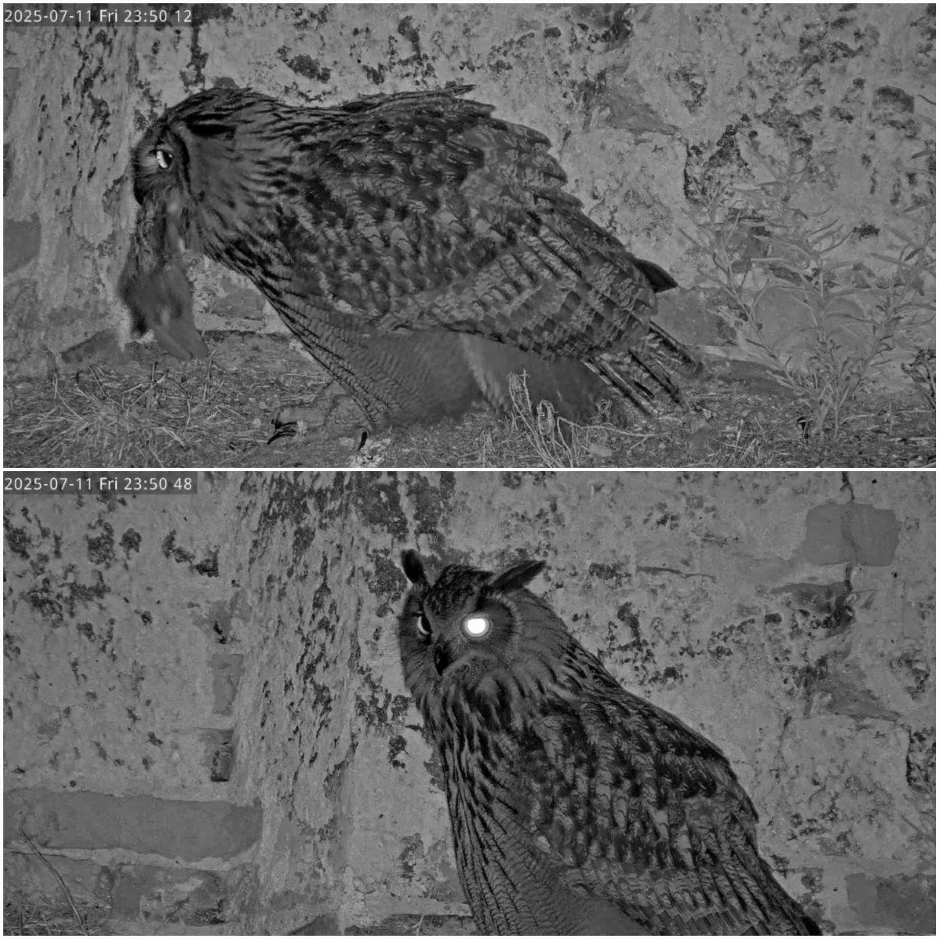 Später: Uhu beobachtet Fledermäuse (links unten im Anflug), sieht aber nicht die Maus im Gras (Augen leuchten rechts von seinem Kopf). Fliegt los…