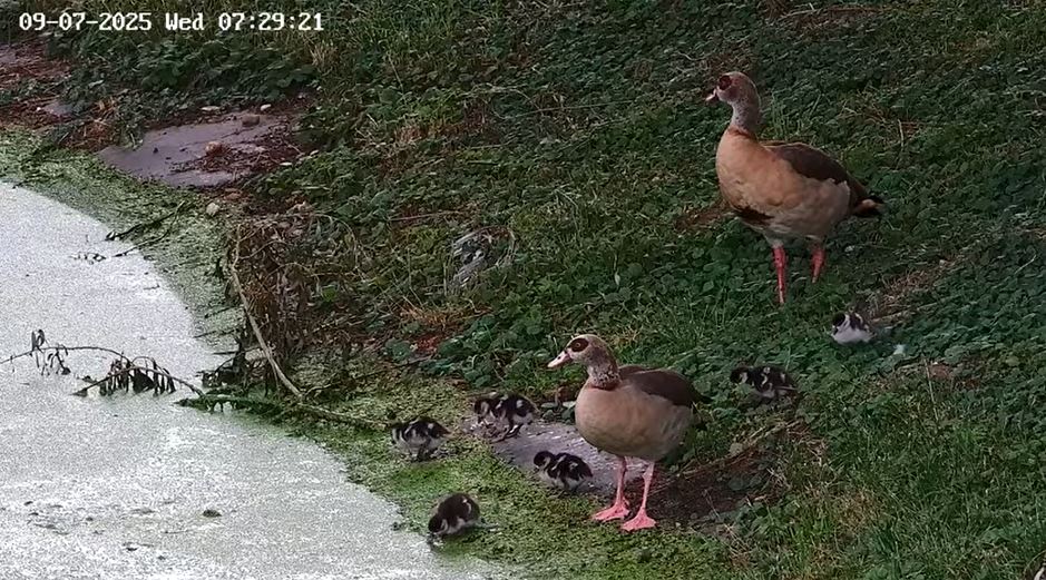 Die Nilgänse haben wieder Nachwuchs. Die 6 Küken dürften genau die ‚Kragenweite‘ für die Youngsters sein. Aber die Altvögel sind sowohl sehr aggressiv als auch wachsam.