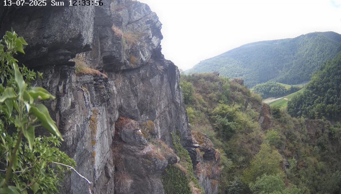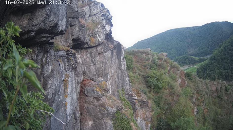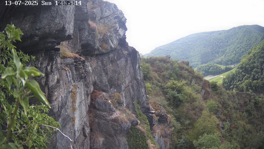 Auf Cam5 im Ahrtal rupft ein Wanderfalke auf den Felsen seine Beute.