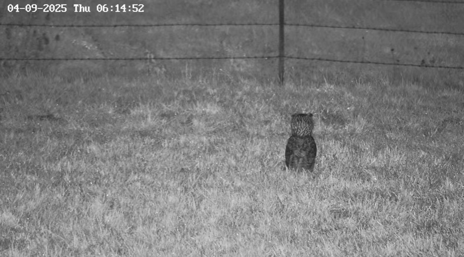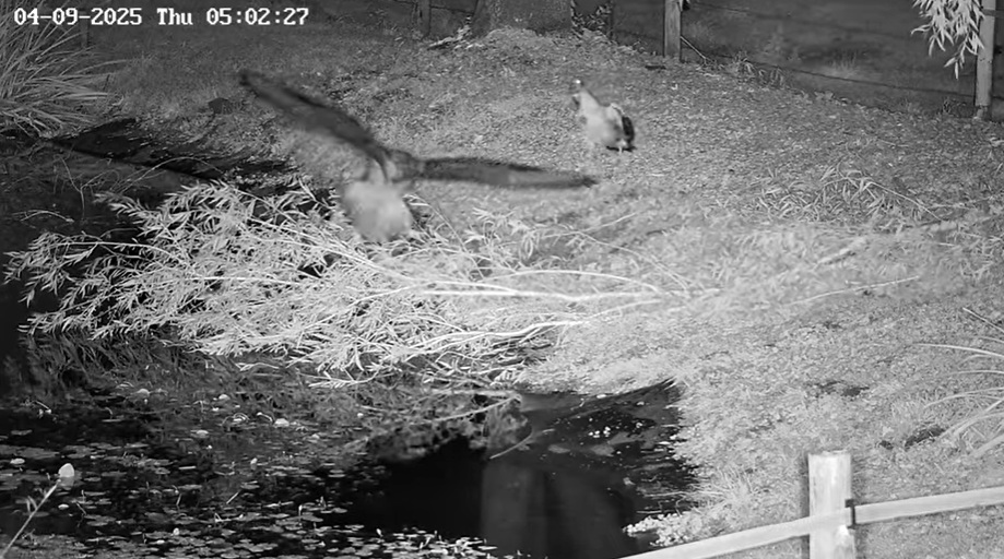 Der zweite Angriff war nur zu hören. Die Gänse bewegten sich zum Zaun. Die Kamera schwenkt, dann lautes Trompeten und ein Uhu fliegt aus der Richtung auf einen der Silageballen.