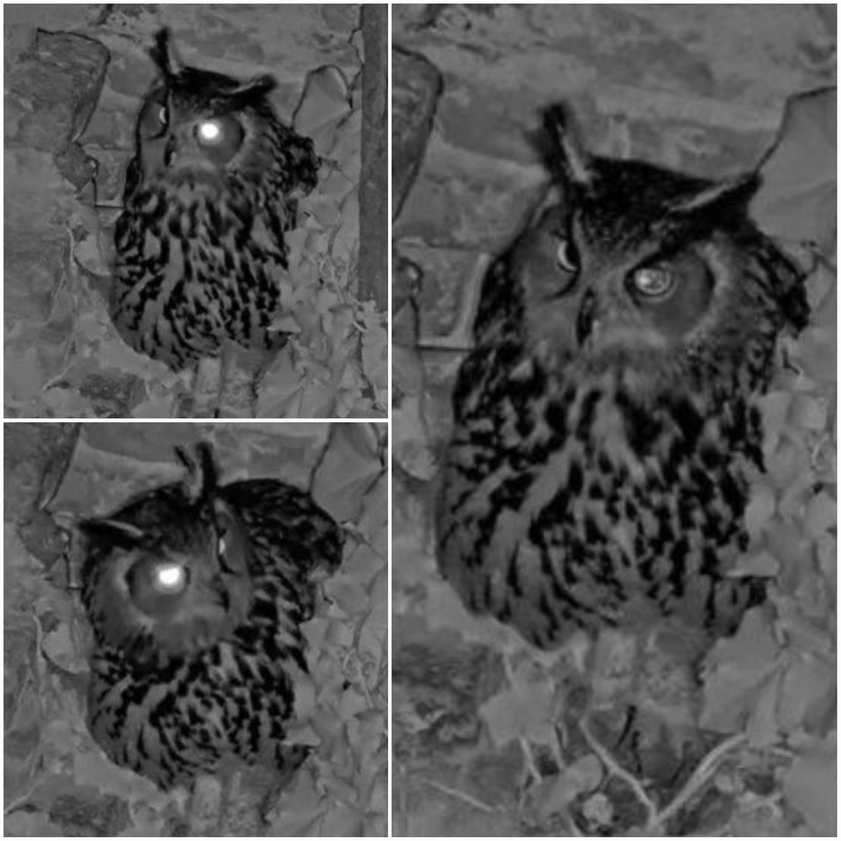 Hier muss ich leider ein Veto einlegen, aber der Lichtpunkt kommt aus meiner Sicht nicht von einem Uhu auf dem Felsen. Sondern aus der Baustelle weiter rechts unten.