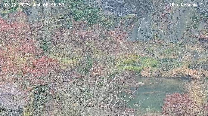 Im Ahrtal vor Cam5 ist einer der Uhus auf dem Aussichtsfelsen zu sehen - naja zumindest die Augen. Wird der Kopf gedreht, ist nichts mehr zu sehen.
