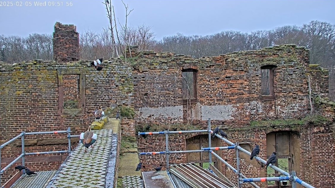 Mittlerweile steht eines der Pärchen auf dem Schornstein, das andere auf der anderen Seite des Gemäuers. Es gibt ein Trompetenkonzert, bei dem wohl die Reviergrenzen festgelegt werden.