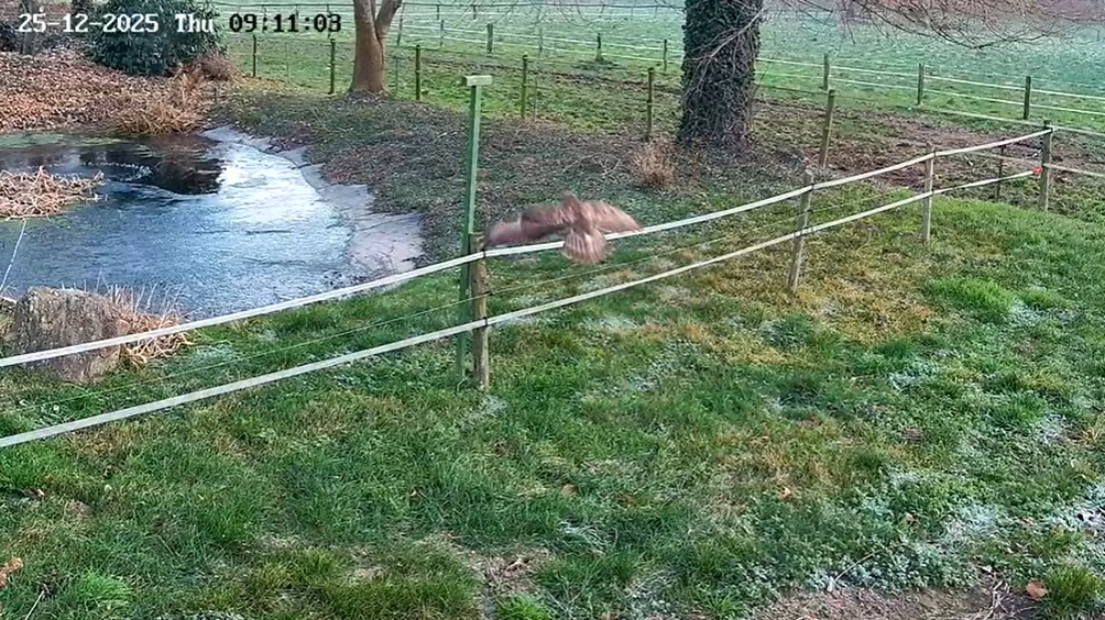 Es war ja schon ein paar Mal ein Mäusebussard am Teich zu Gast. Leider hielt er sich bisher immer im Schatten auf, so dass er auf einem Screenshot nur schwer zu erkennen gewesen wäre. Aber heute hat er den Ansitz am Teich angeflogen - begleitet vom aufgeregten Geschnatter der Nilgänse.