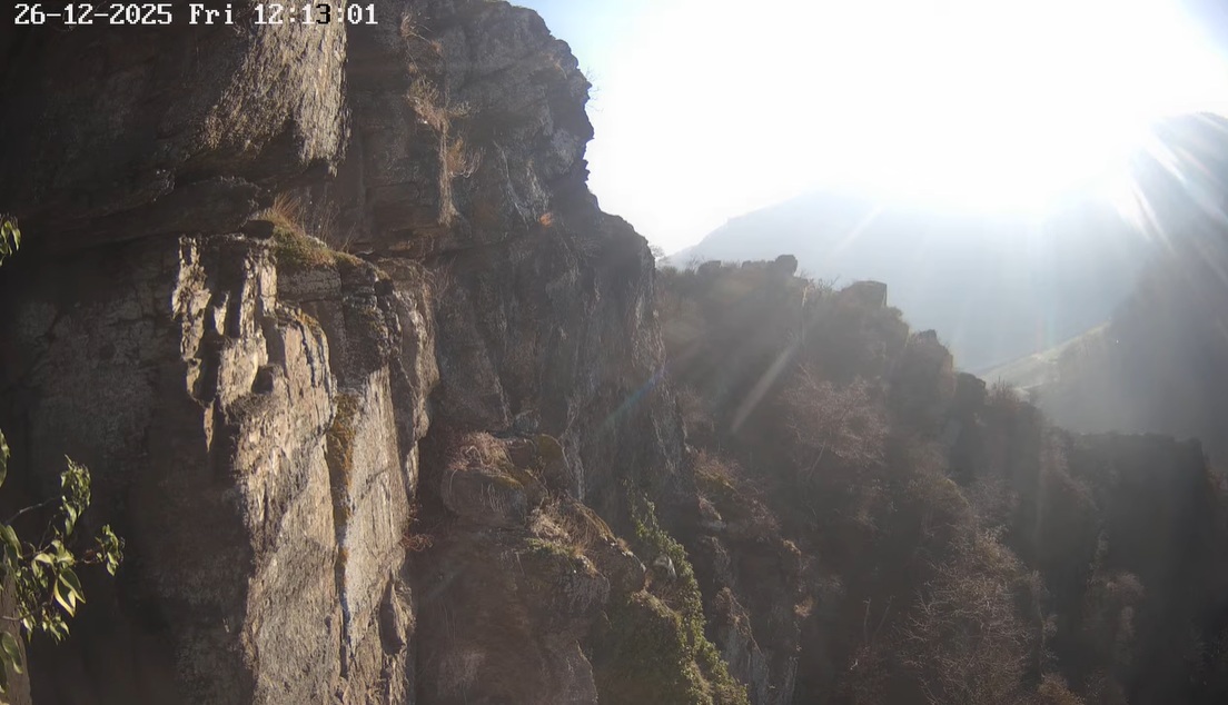 Einer der beiden Wanderfalken landet auf den Felsen vor Cam5 im Ahrtal.