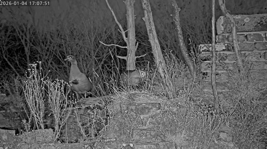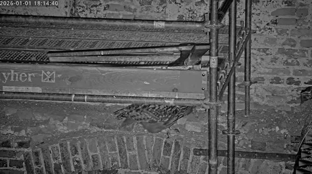 Die ehemalige Brutnische wird nach wie vor von Waschbären besucht, sodass es unwahrscheinlich ist, dass Lotte diesen Platz für ihr Gelege wählen wird. Dafür gibt es in unmittelbarer Nähe einen Ort, an dem sich Lotte & Leo treffen, paaren und hoffentlich in Sicherheit brüten und die Junguhus aufziehen können.