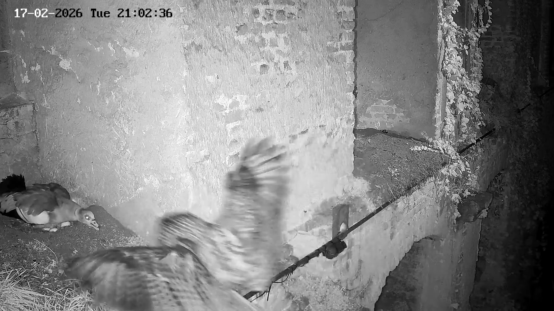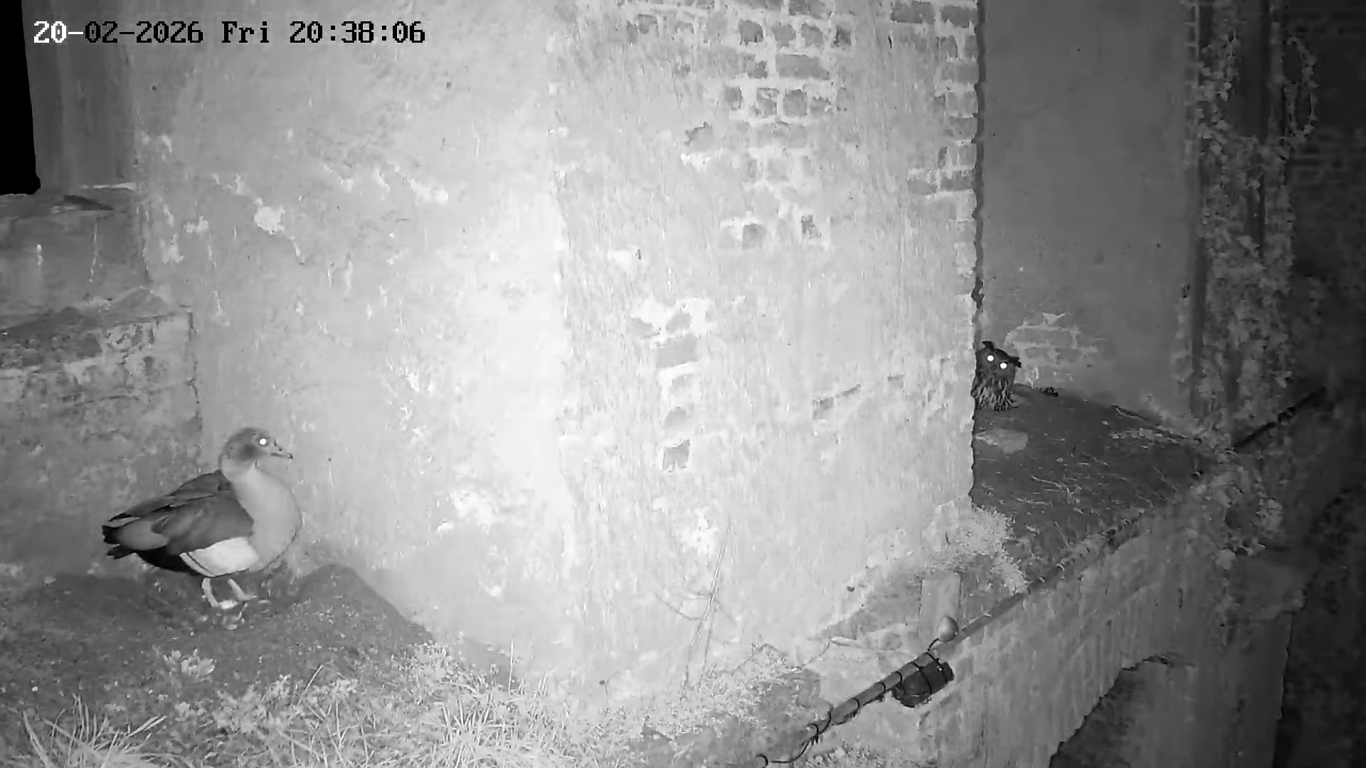 Die Gans flieht anscheinend auf die gegenüberliegende Mauer und fliegt dann durch das Fenster über Isoldes Gelege. Sie sofort hinterher. Aber etwa 5 Minuten später sitzt die Gans wieder auf ihren Eiern.