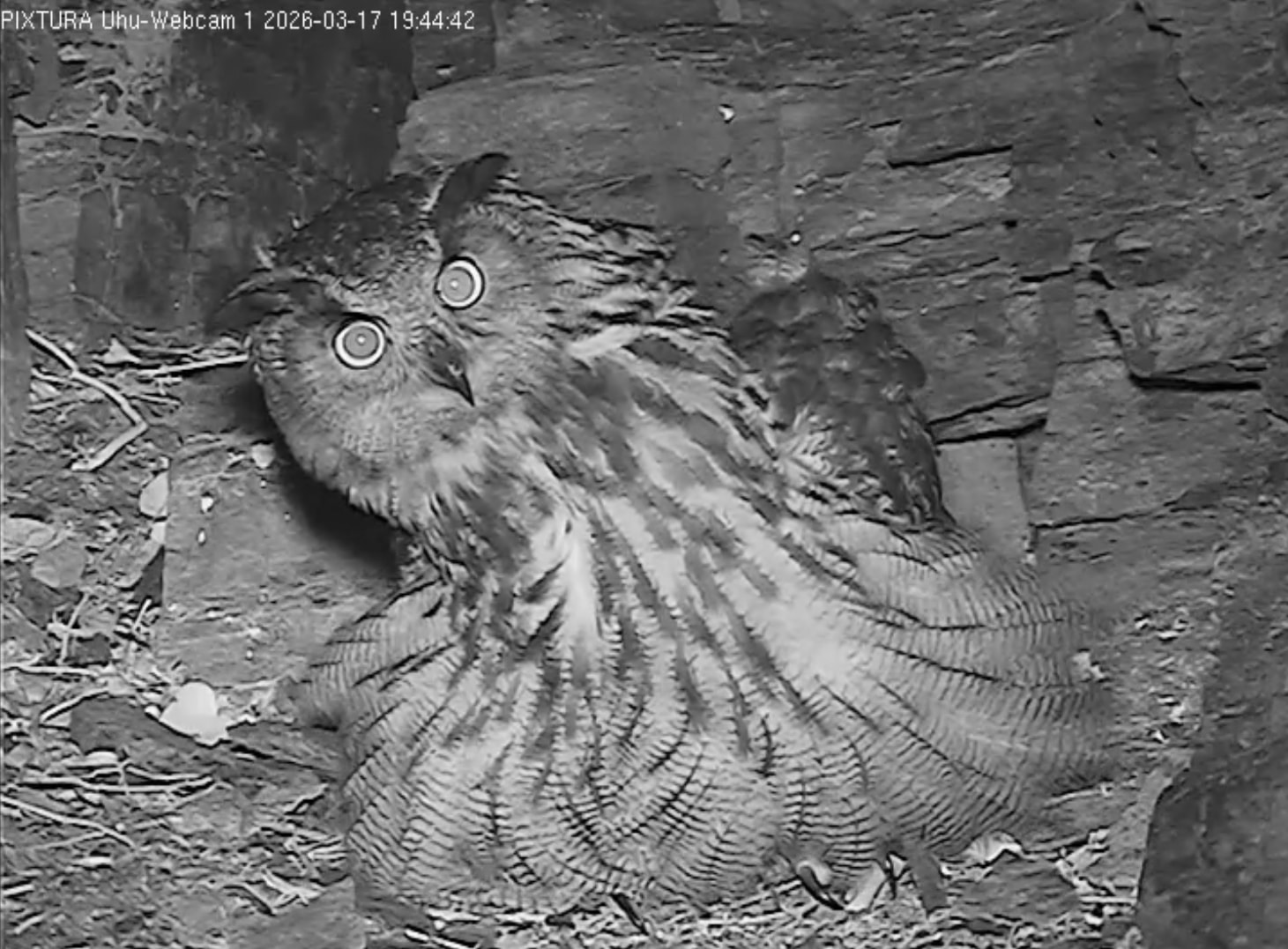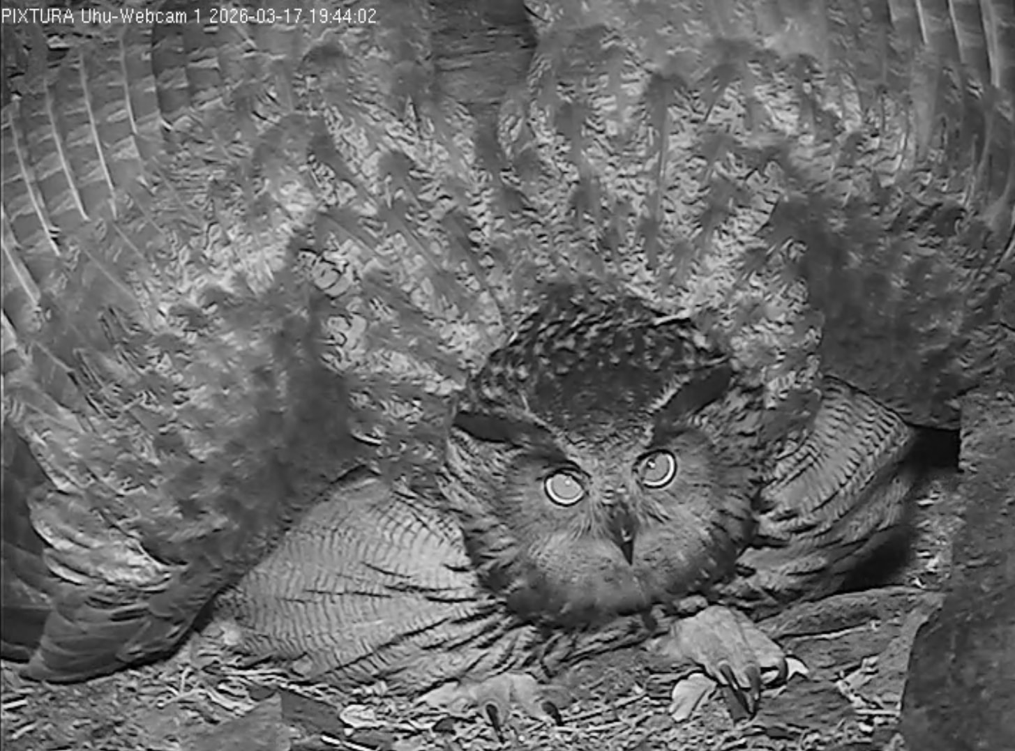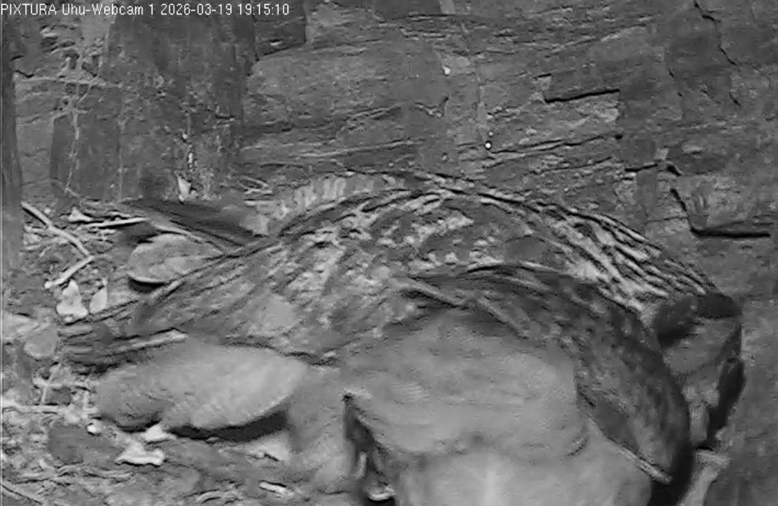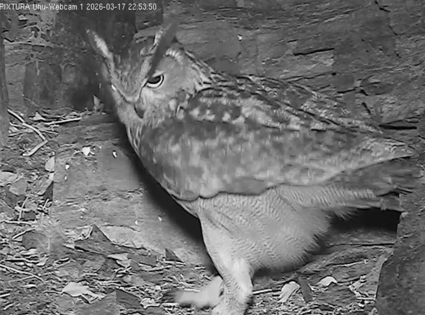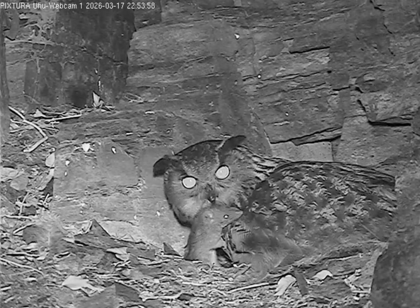 In Marburg ist gerade wohl das erste Küken geschlüpft. Man hört es ziemlich laut piepen zwischen 22:30-22:40 und Mama Uhu scheint dabei zu helfen sich aus dem Ei zu pellen. Tatsächlich sehen tut mak es bisher nicht , da die Kamera den Boden nicht einfängt.