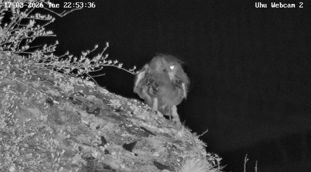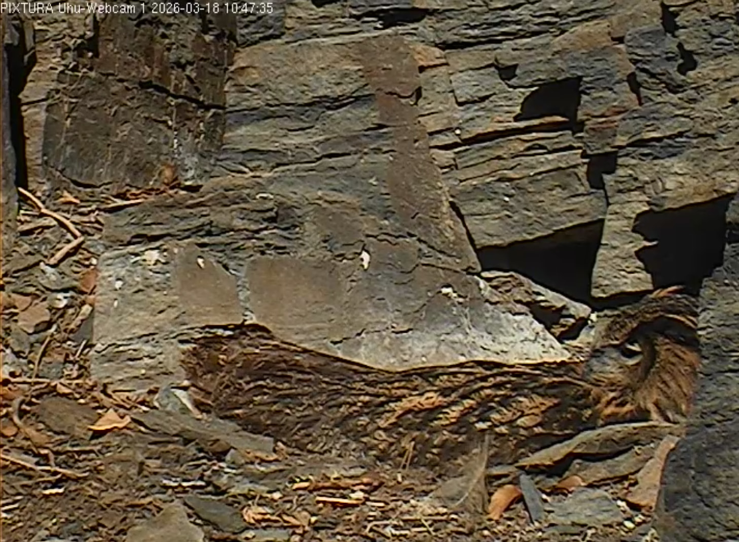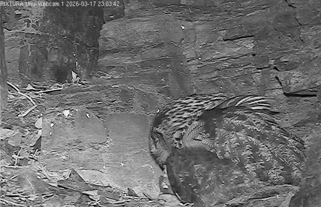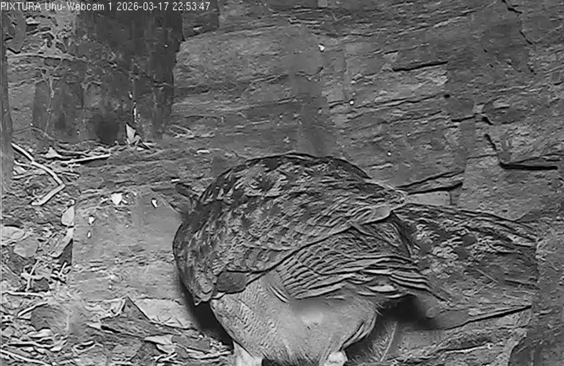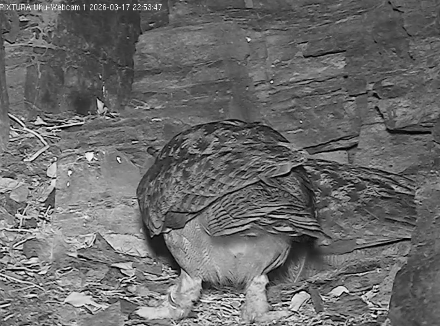 In Marburg ist gerade wohl das erste Küken geschlüpft. Man hört es ziemlich laut piepen zwischen 22:30-22:40 und Mama Uhu scheint dabei zu helfen sich aus dem Ei zu pellen. Tatsächlich sehen tut mak es bisher nicht , da die Kamera den Boden nicht einfängt.