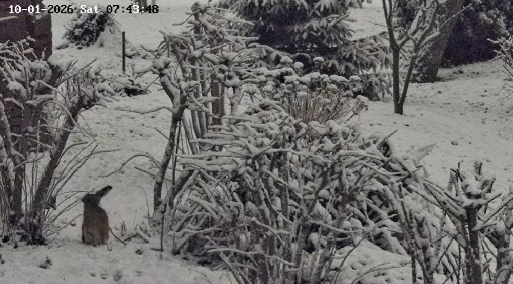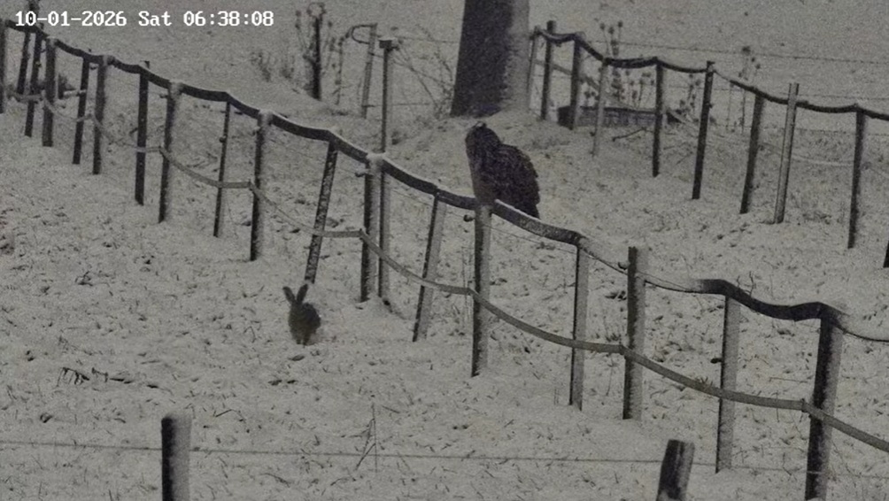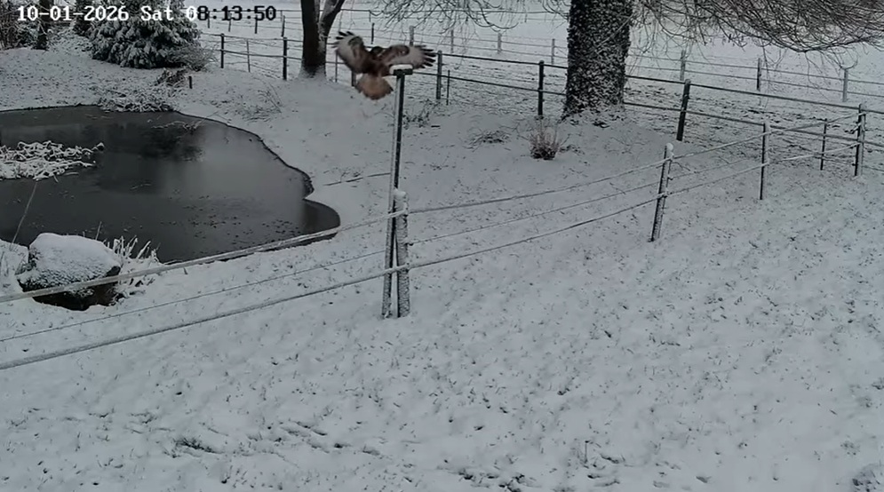Durch den Schnee sind die Kontraste höher und auch die anderen Tiere sind gut sichtbar: Hase und Bussard im Landeanflug auf dem Ansitz am Teich.