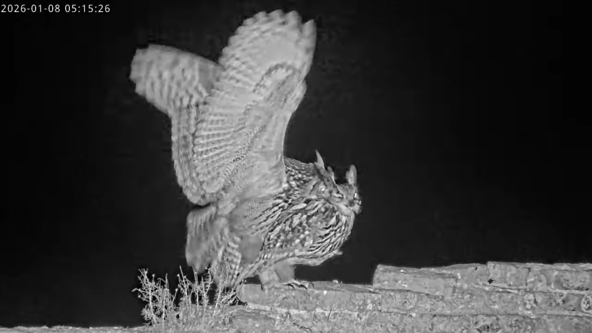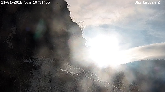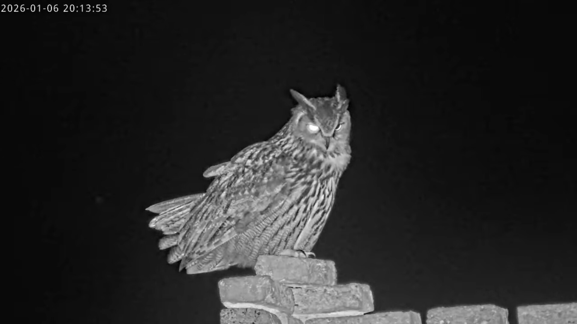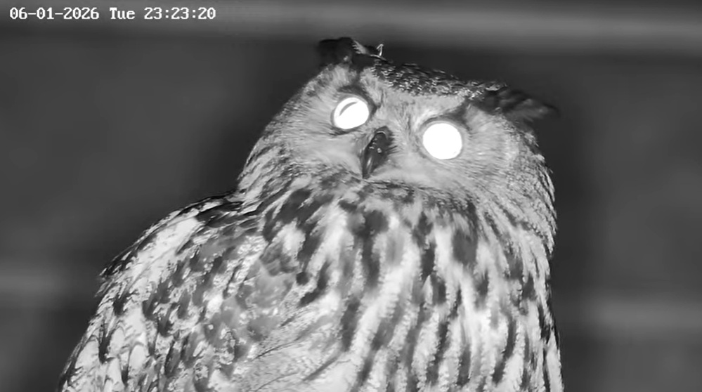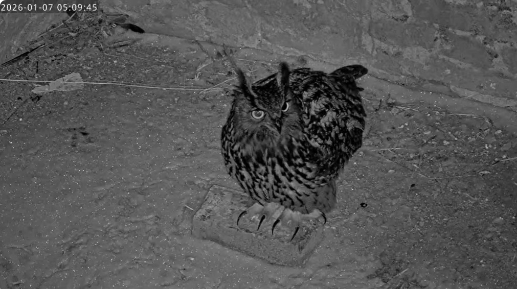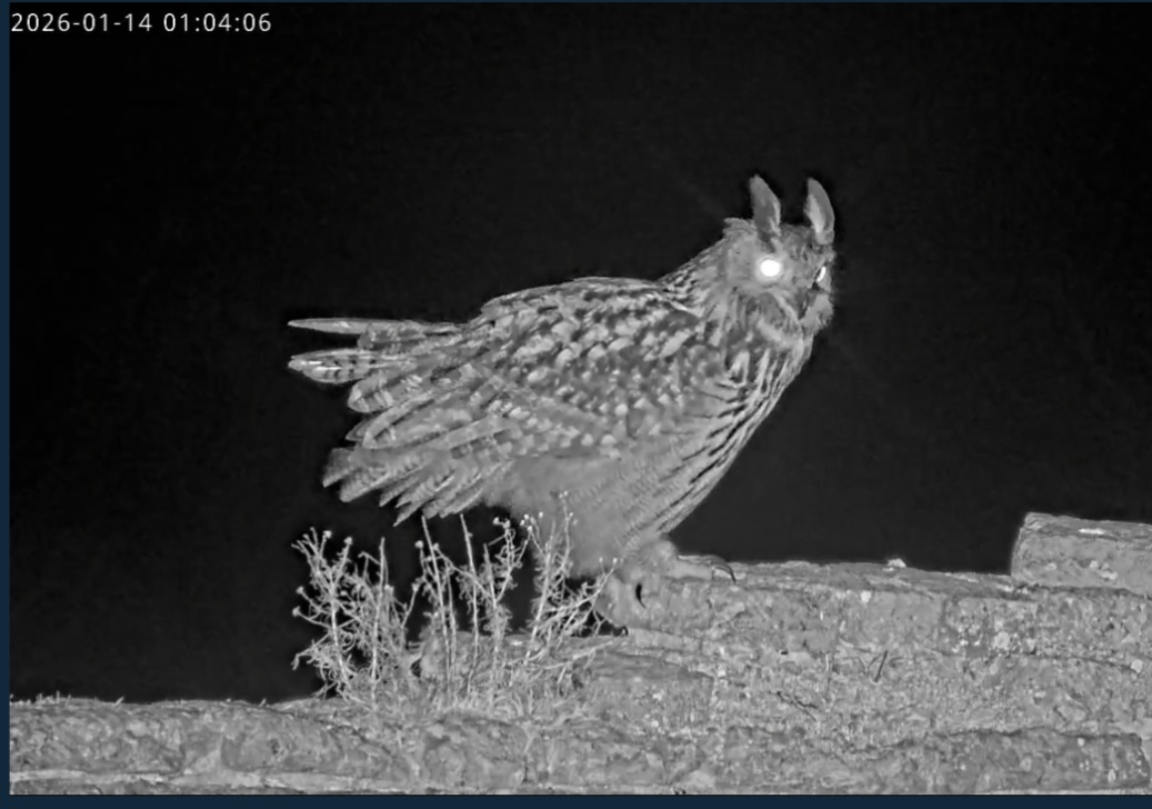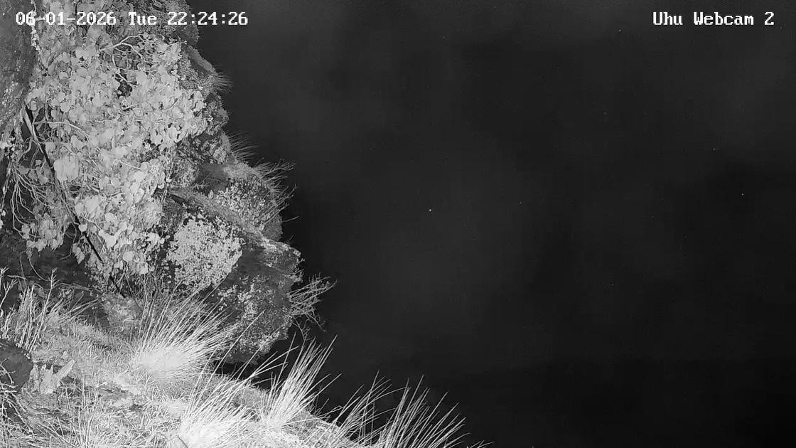 Cam2 im Ahrtal ist noch nicht im Nachtmodus, aber da sitzt ein Uhu auf dem Aussichtsfelsen.