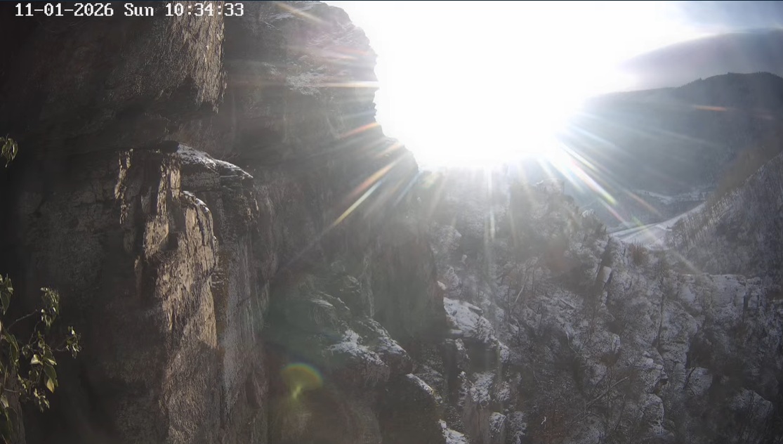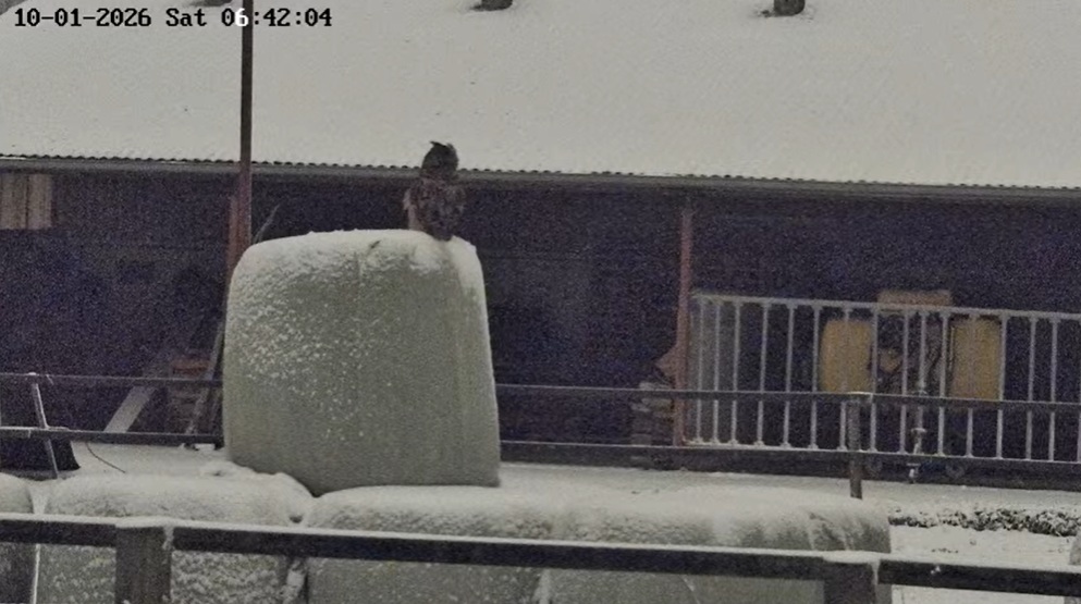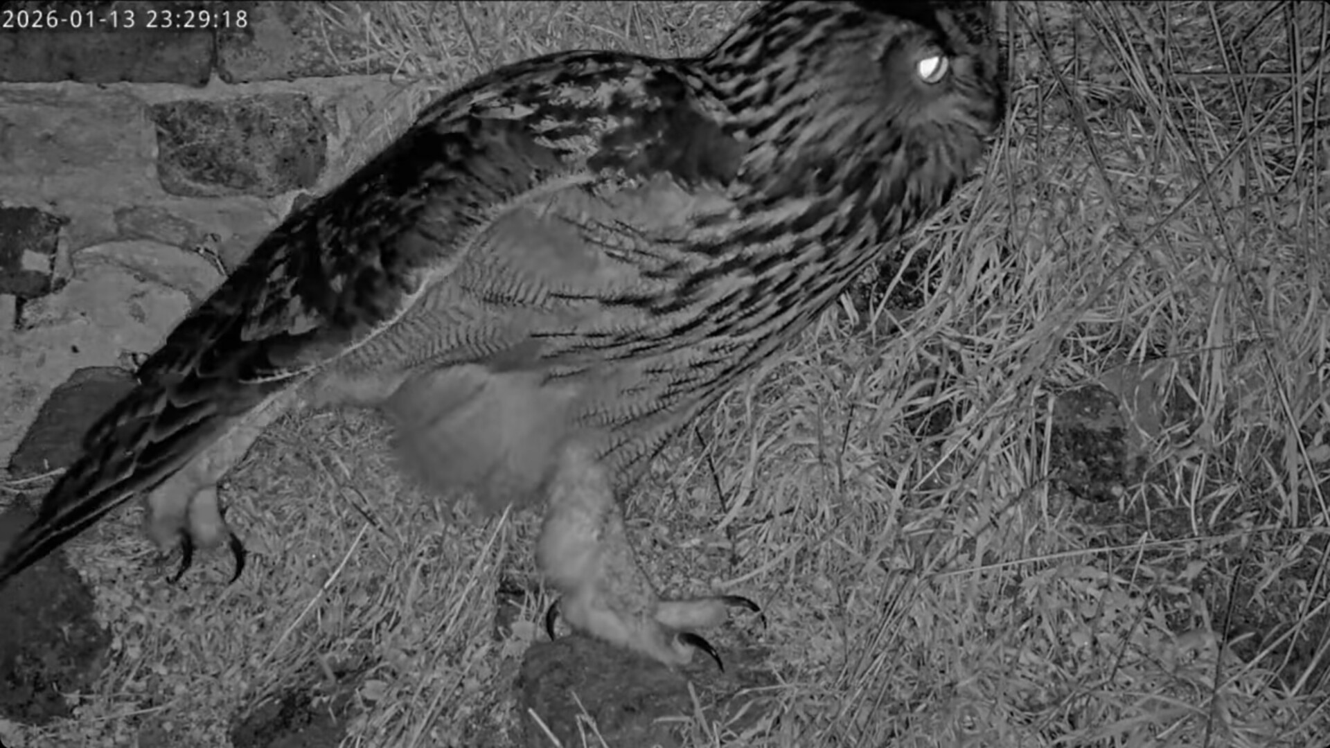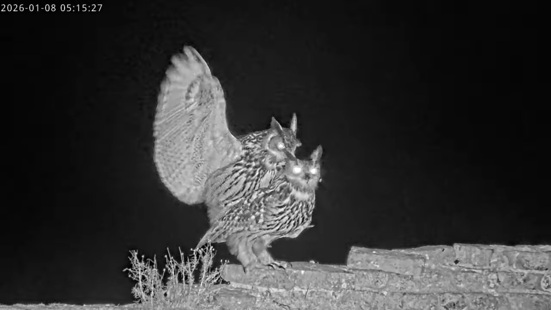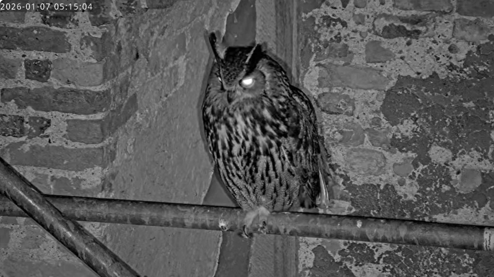 Cam2 im Ahrtal ist noch nicht im Nachtmodus, aber da sitzt ein Uhu auf dem Aussichtsfelsen.