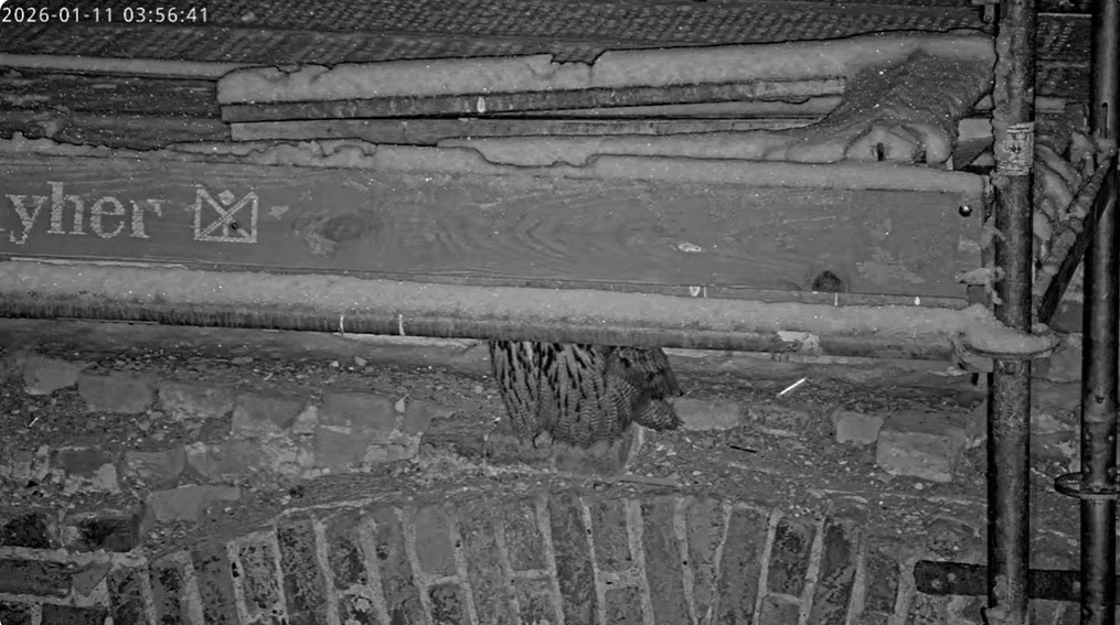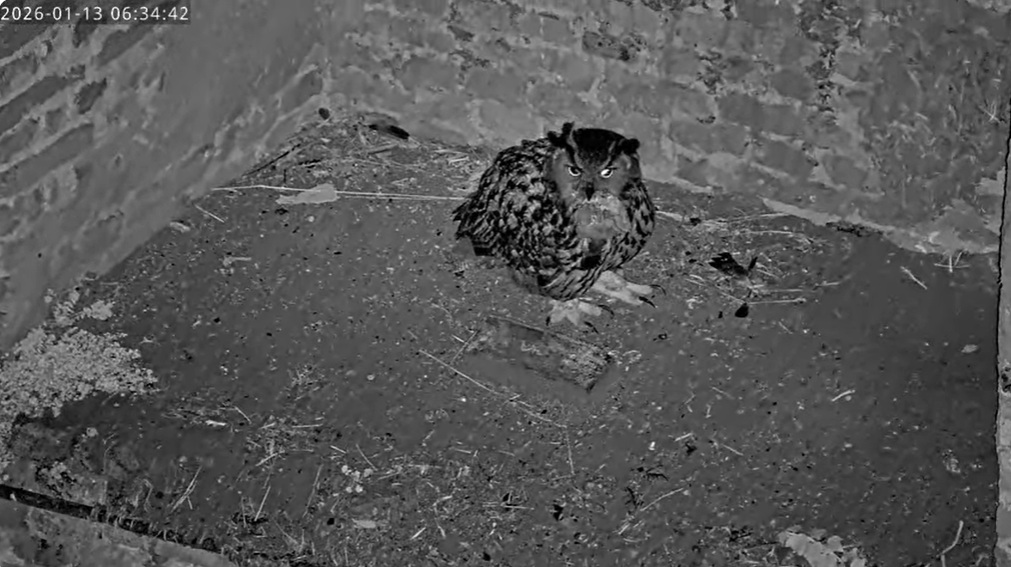 Erst frische Uhuspuren in der Brutnische (mitsamt Uhu),