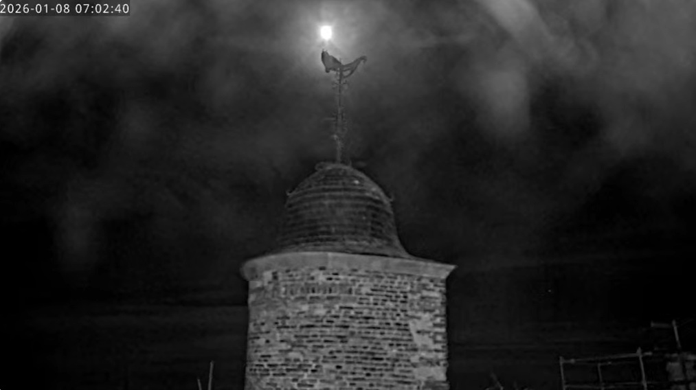 Eine wunderschöne Szene auf der Windanzeige des Turmes über dem strahlenden Mond. Das dürfte Isolde sein.