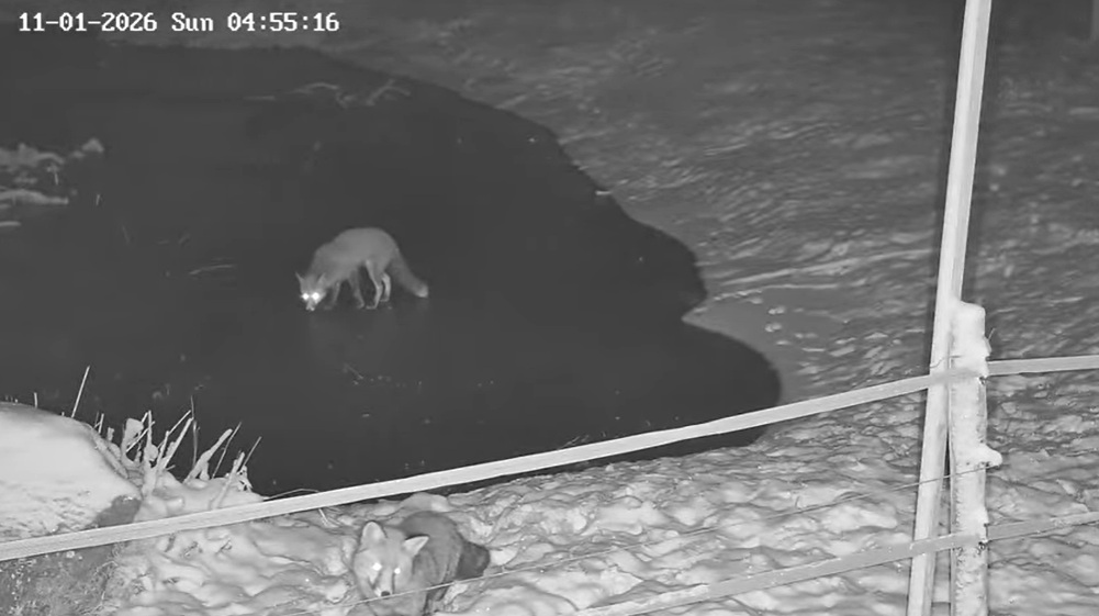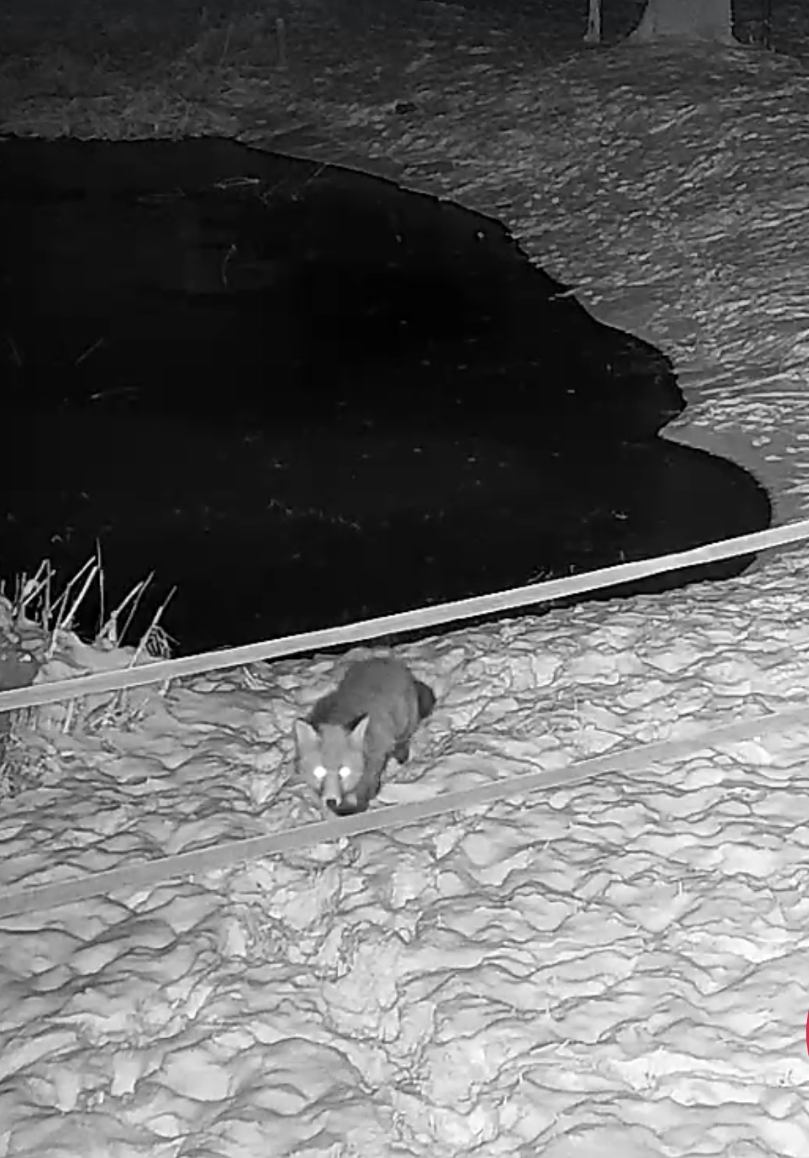 Die Füchse tollen am Teich und einer erkundet mutig die Eisdecke.