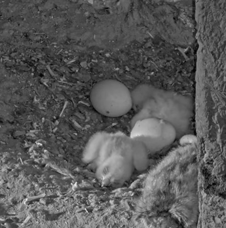 Um es besser erkennen zu können, müsste Isolde einmal kurz wegfliegen. Aber sie frisst die Eierschale. Das Zweitgeborene ist definitiv da.