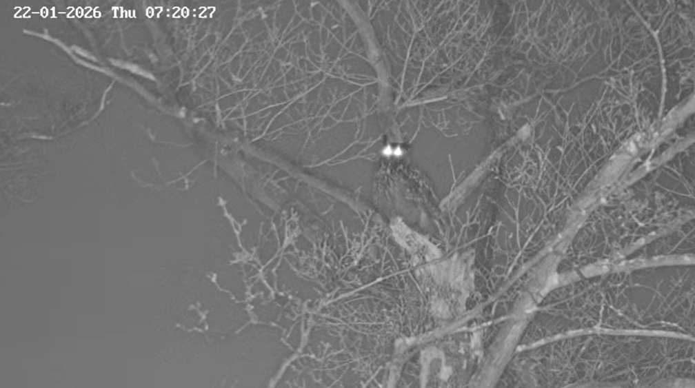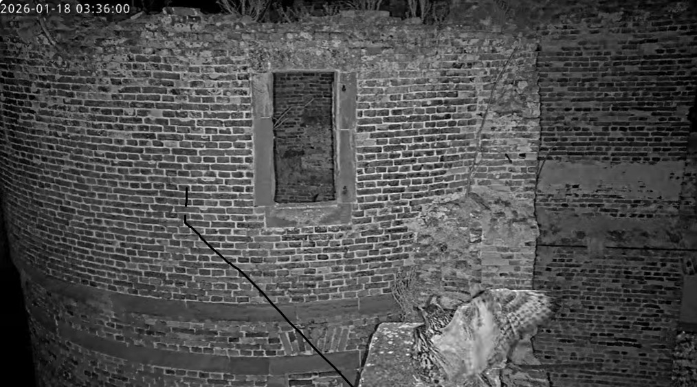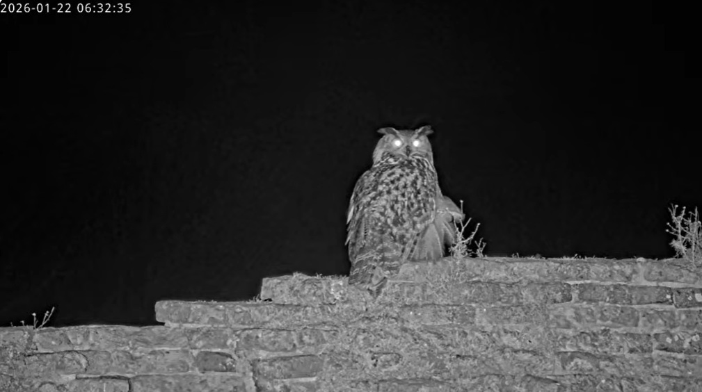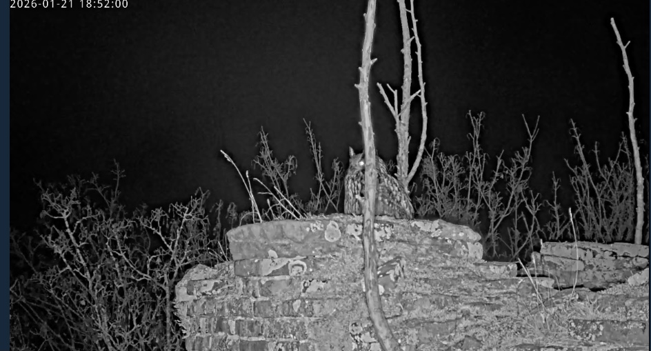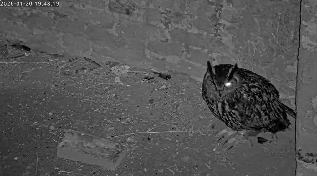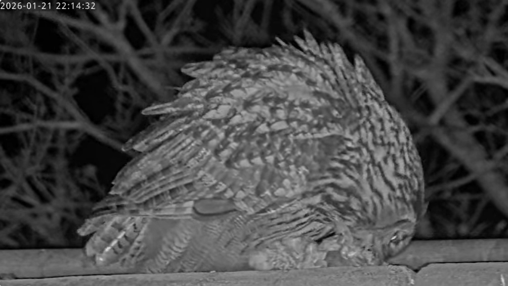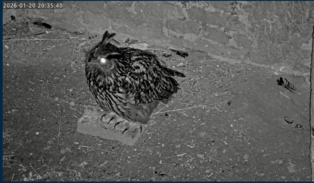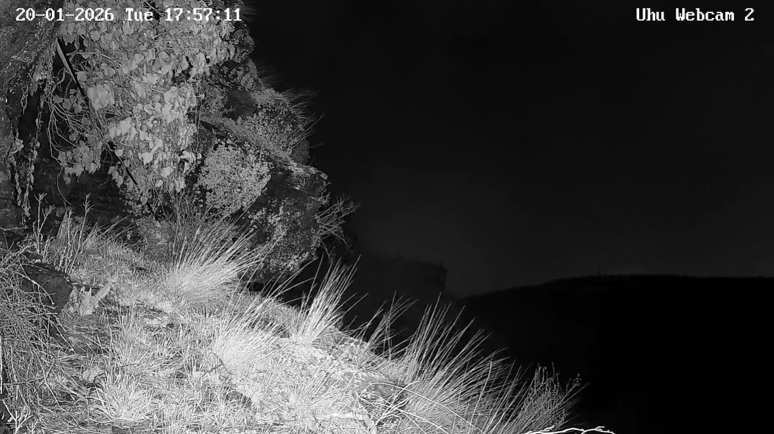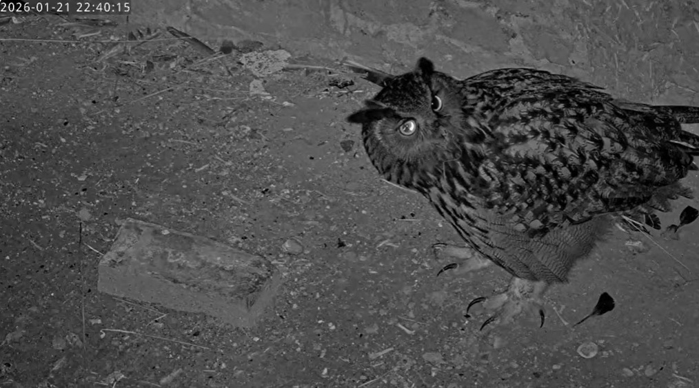 Um 17.42 h flog vermutlich einer der beiden Uhus vor Cam2 durchs ‘Bild’. Für einen Wanderfalken eindeutig zu groß, könnte es auch ein Bussard gewesen sein? Leider war ich nicht schnell genug für einen Screen. Gleichzeitig vor Cam1 ein Waschbär.