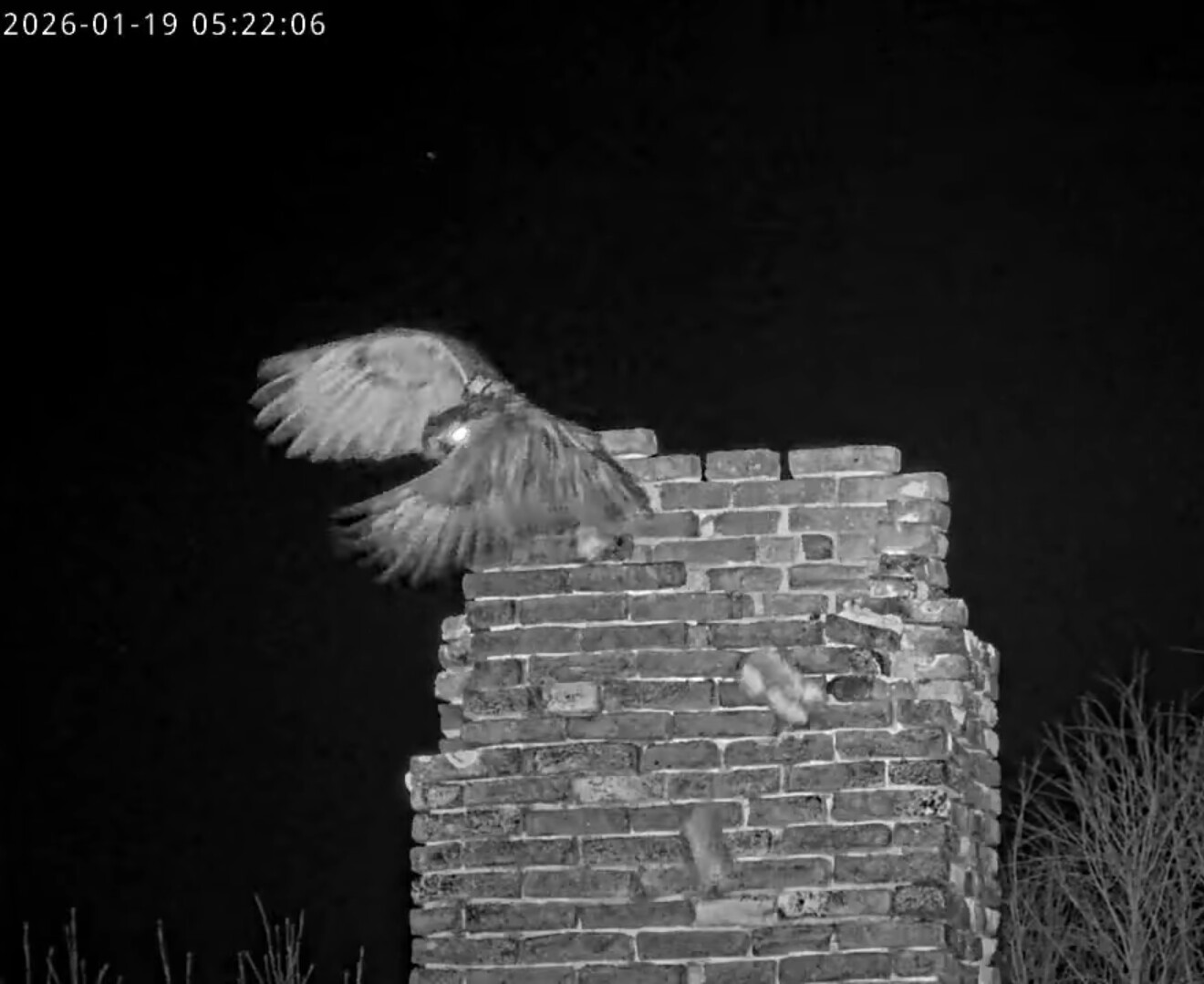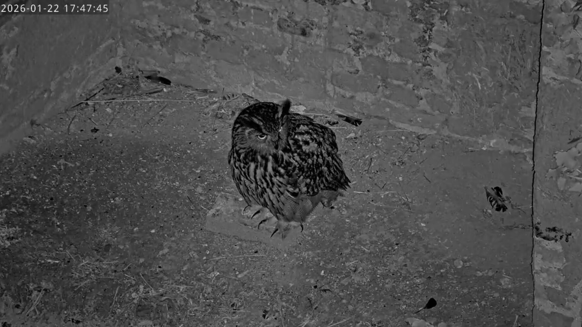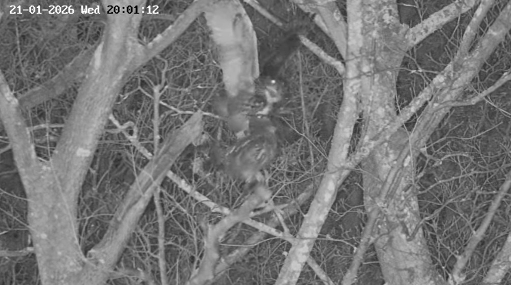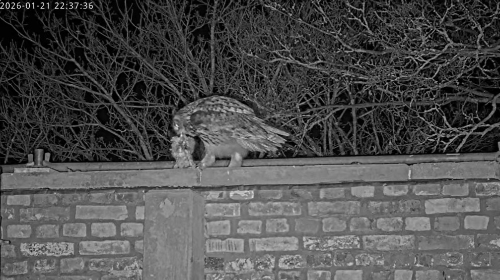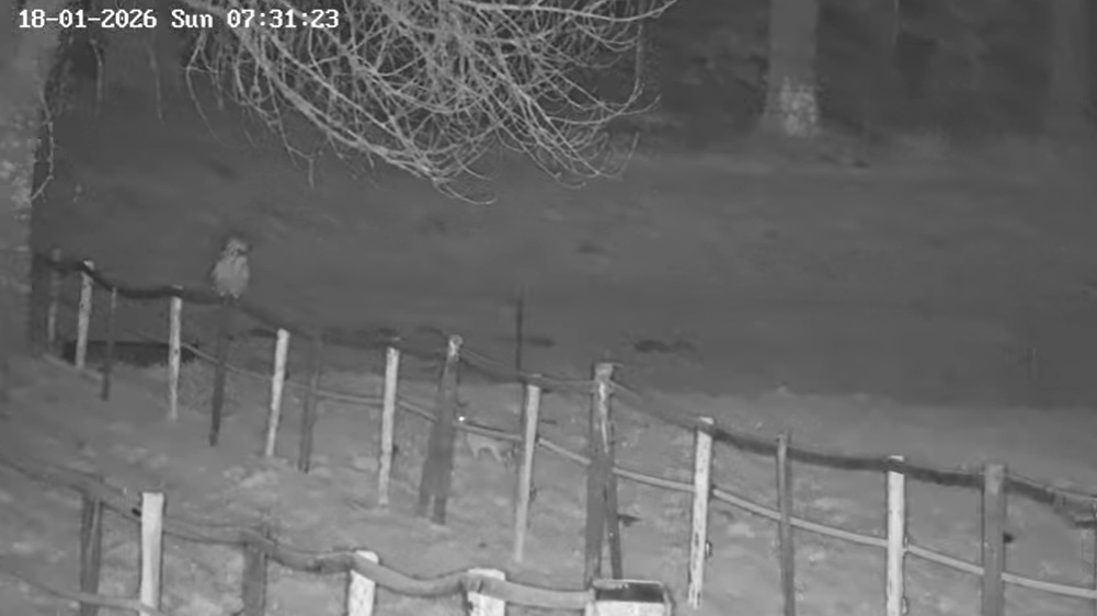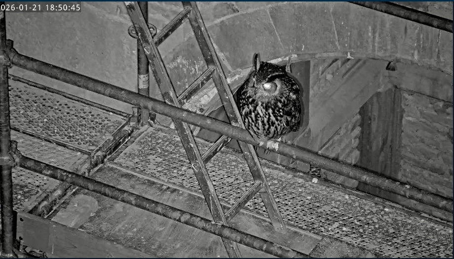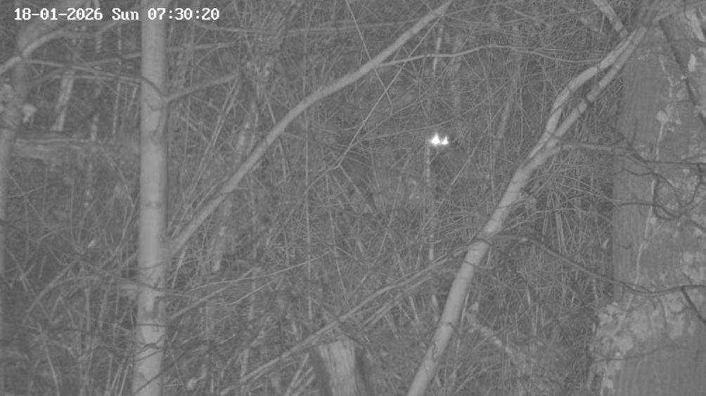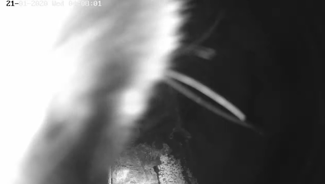 Um 17.42 h flog vermutlich einer der beiden Uhus vor Cam2 durchs ‘Bild’. Für einen Wanderfalken eindeutig zu groß, könnte es auch ein Bussard gewesen sein? Leider war ich nicht schnell genug für einen Screen. Gleichzeitig vor Cam1 ein Waschbär.