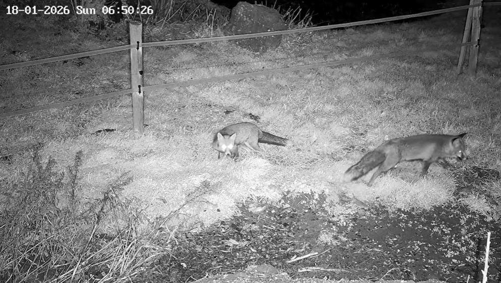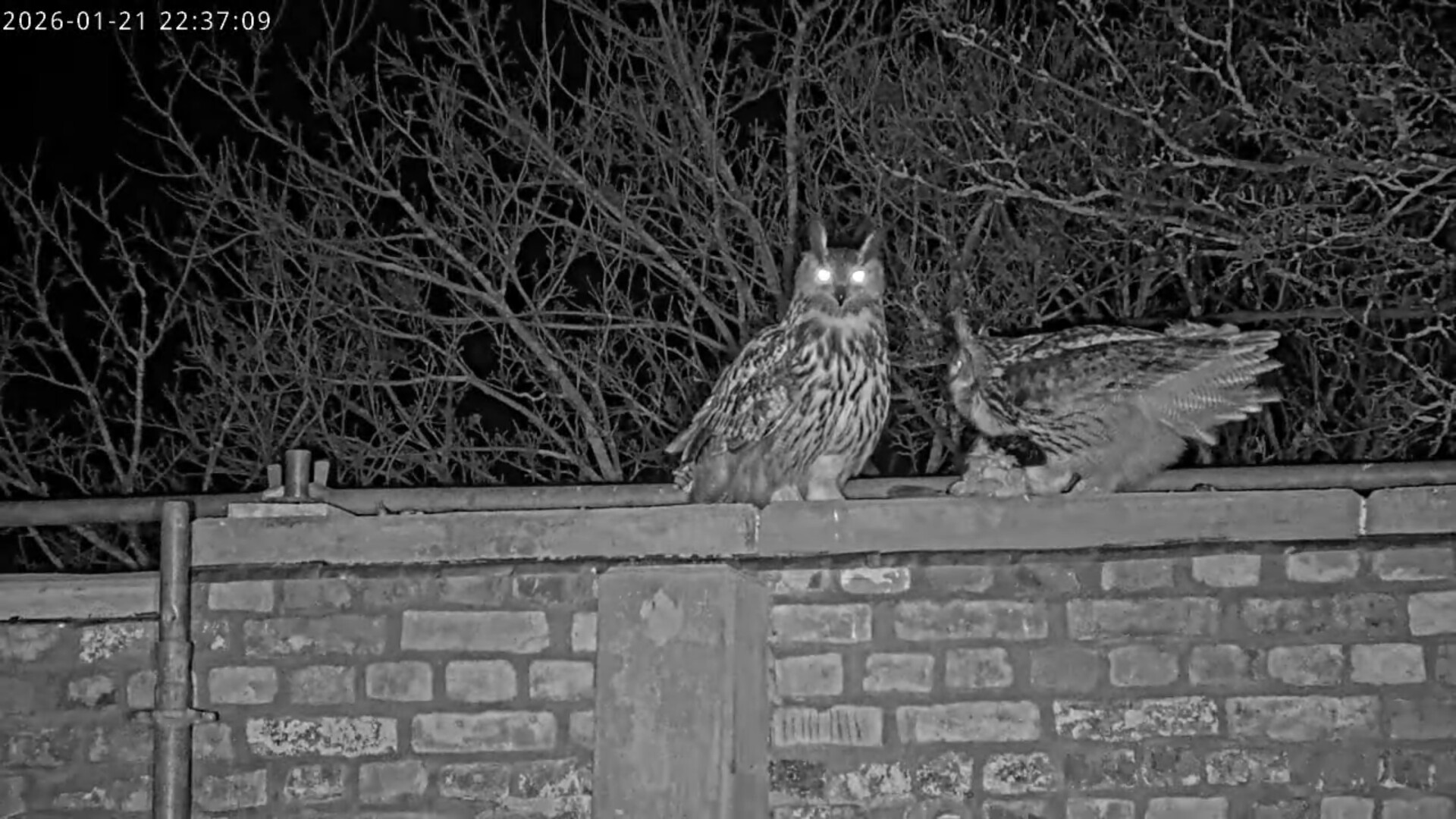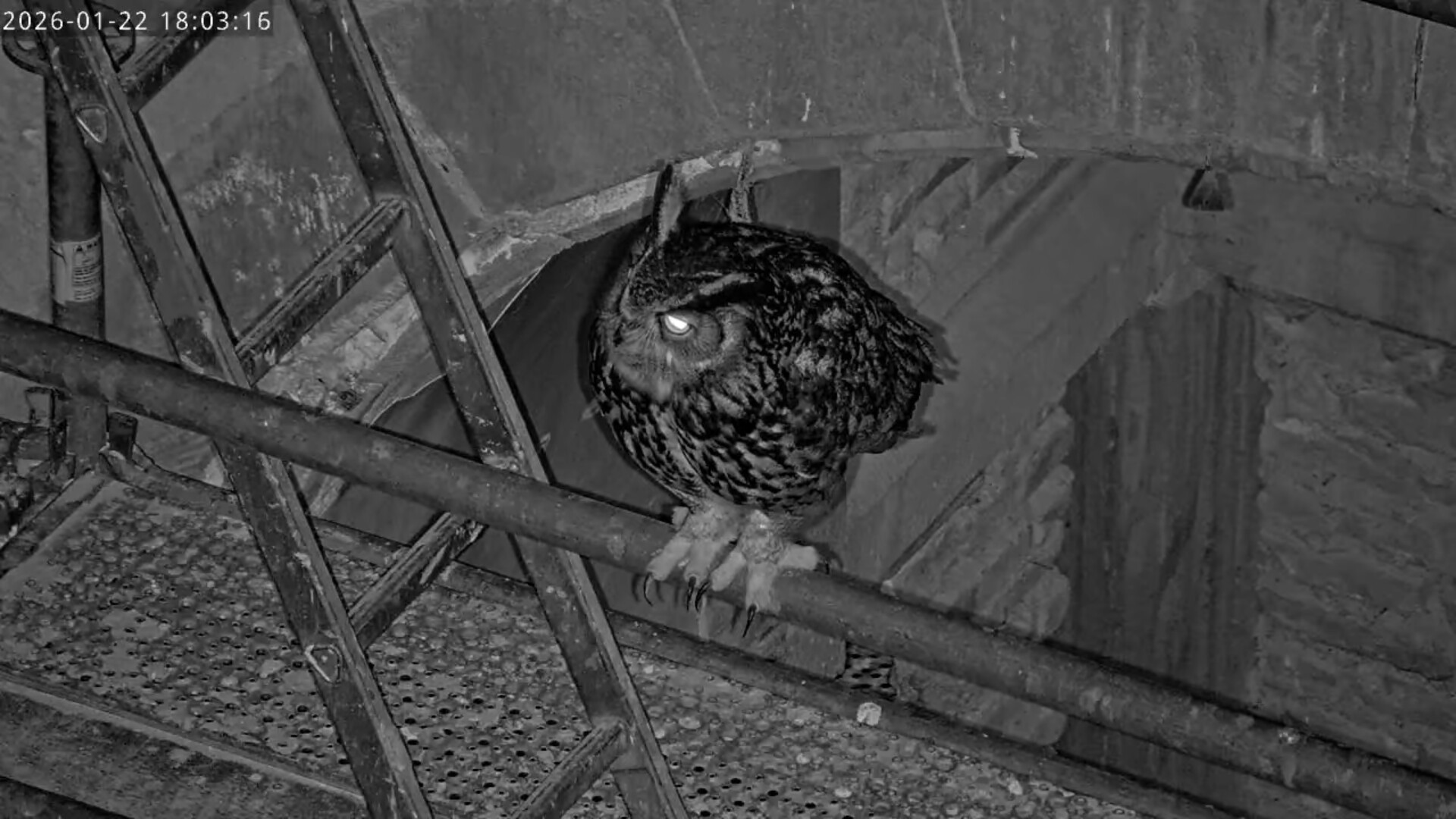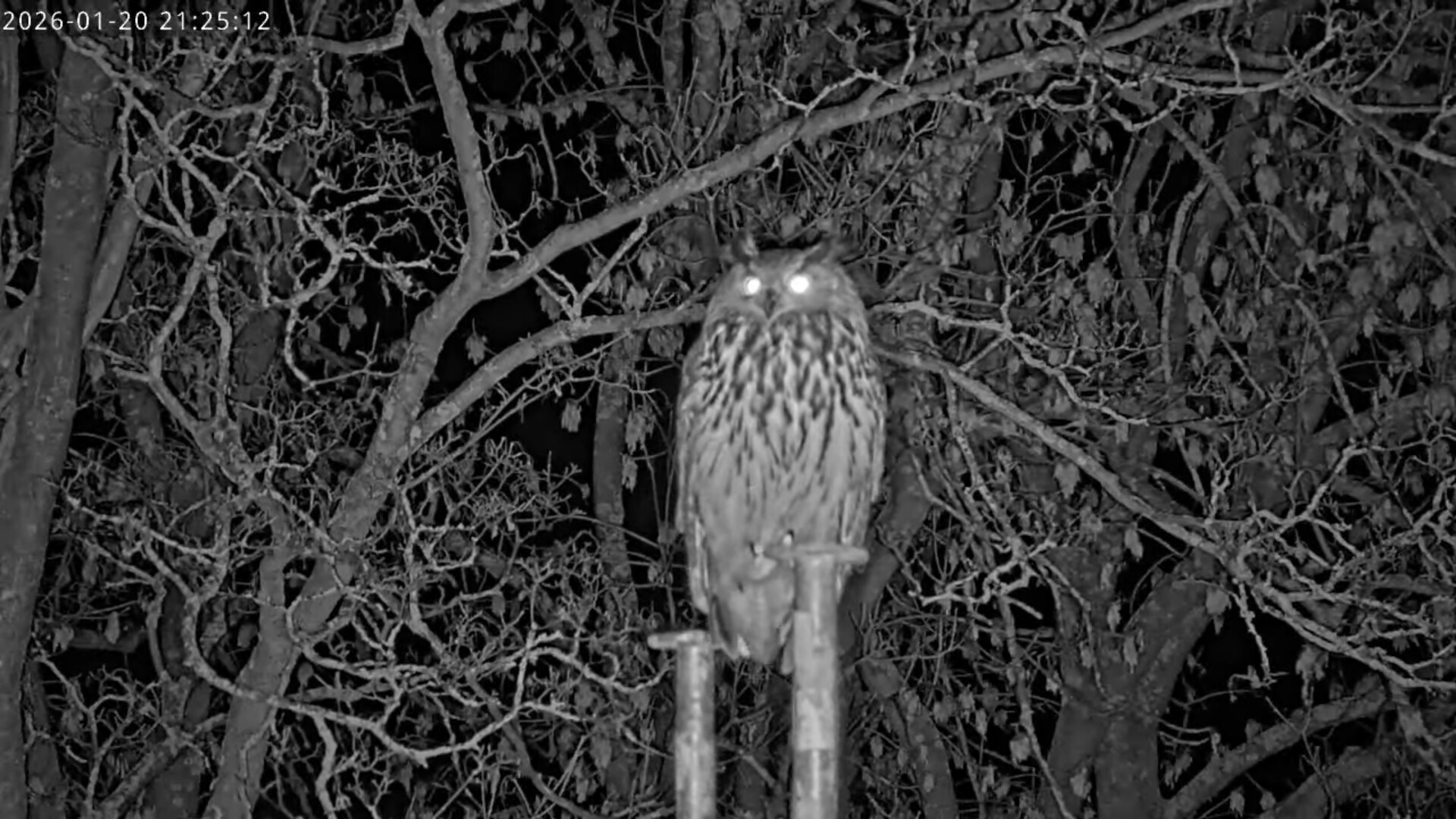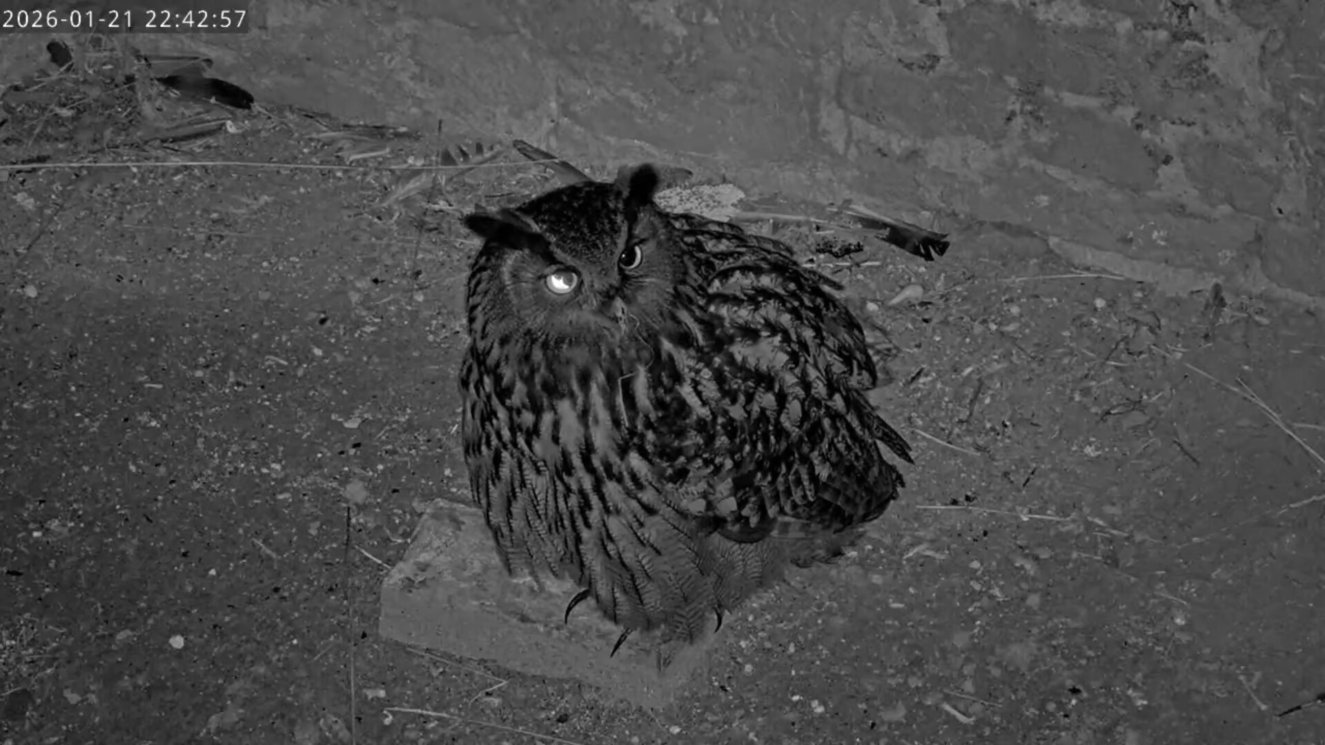Um 17.42 h flog vermutlich einer der beiden Uhus vor Cam2 durchs ‘Bild’. Für einen Wanderfalken eindeutig zu groß, könnte es auch ein Bussard gewesen sein? Leider war ich nicht schnell genug für einen Screen. Gleichzeitig vor Cam1 ein Waschbär.