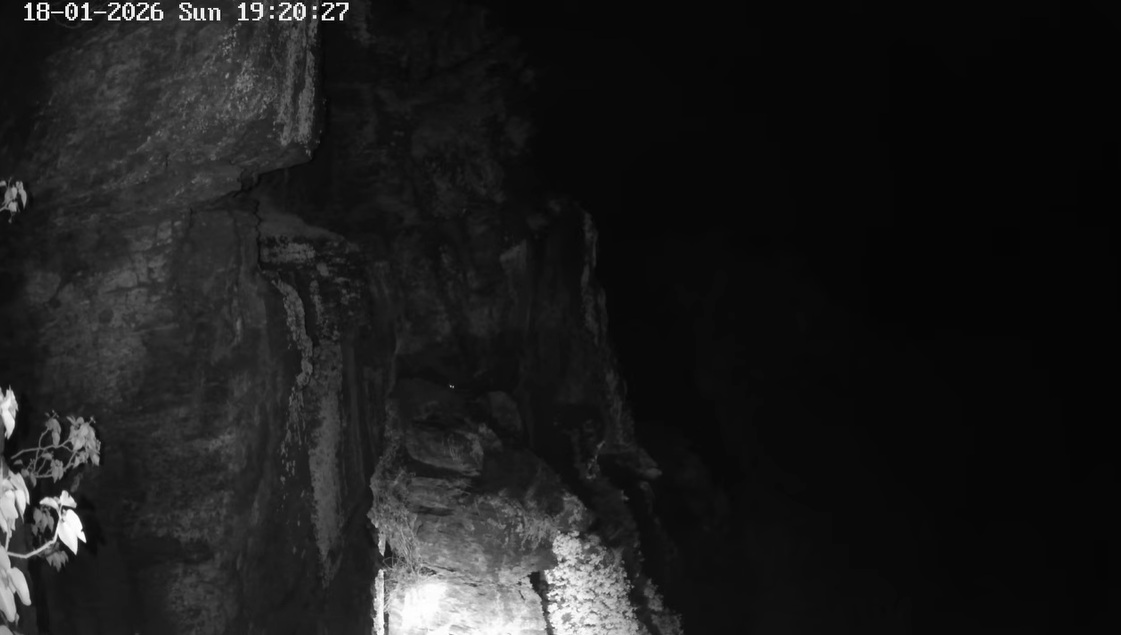 Der Waschbär vor Cam5 scheint an der beleuchteten senkrechten Felsformation hoch auf den Felsen zu klettern. Vor 2 Tagen ist er ebenfalls von dort hoch- und dann wieder heruntergeklettert.