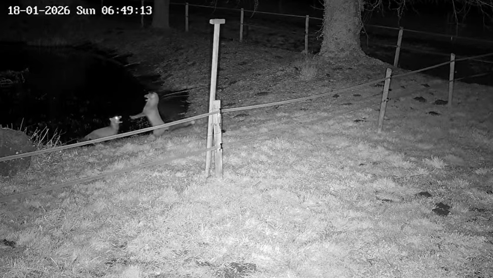 während der andere auf einem Zaunpfahl am Bach sitzt und ein Hasentier beobachtet. Kurze Zeit später erfolgt ein (halbherziger) Angriff.