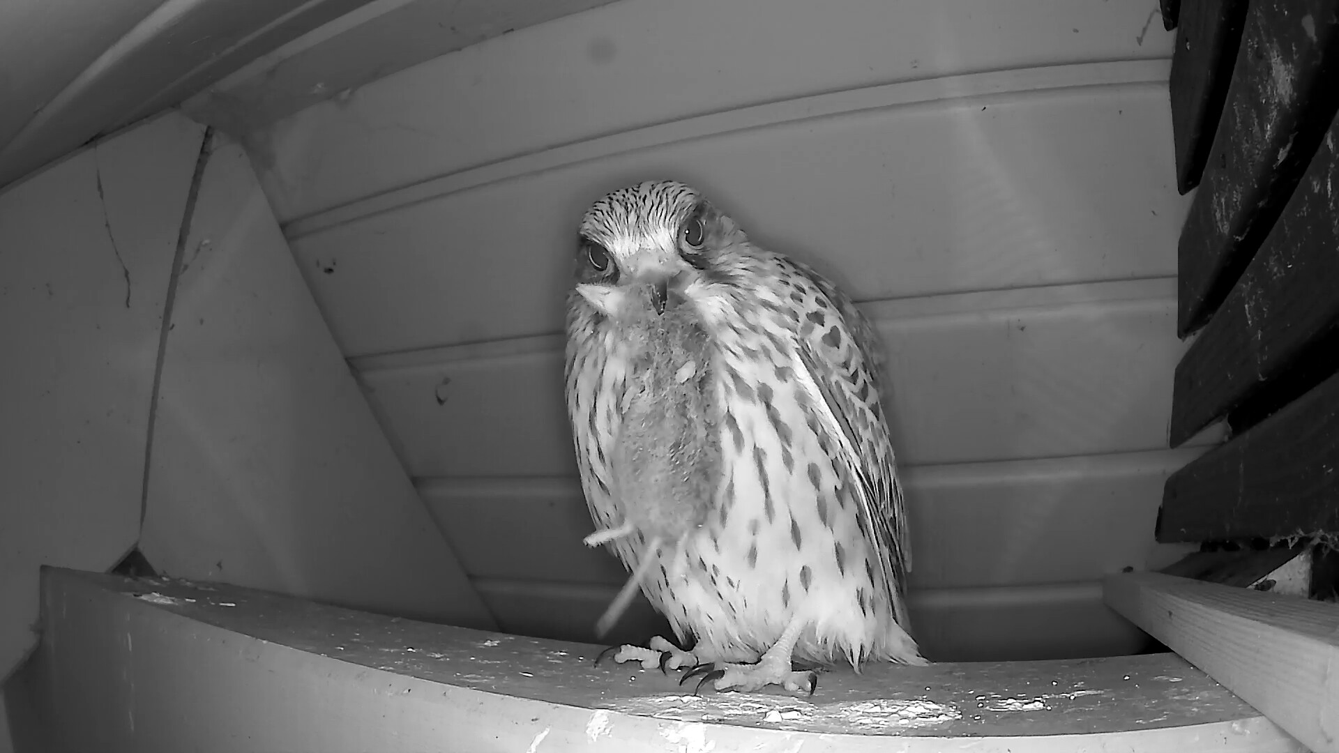 Sie ist 1min kopfwippend auf dem Balken rumgelaufen bis sie sich dann herunter gestürzt hat und ca. 2min später mit der Maus zurück kam.