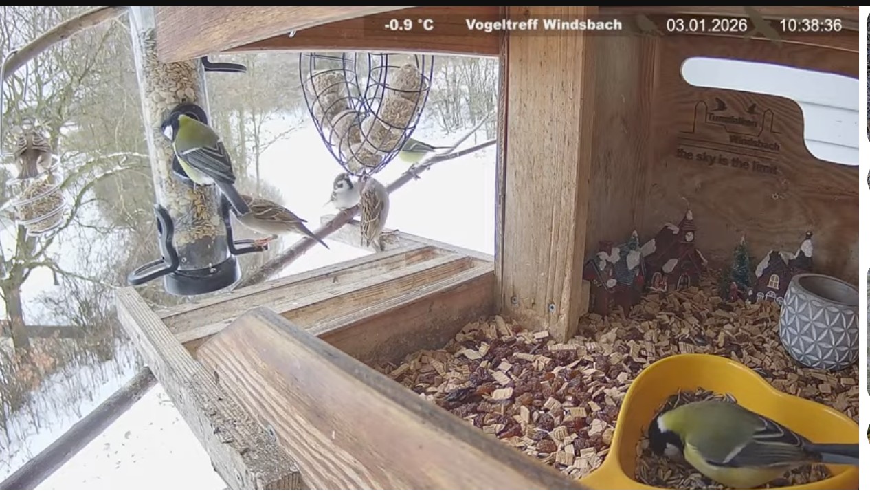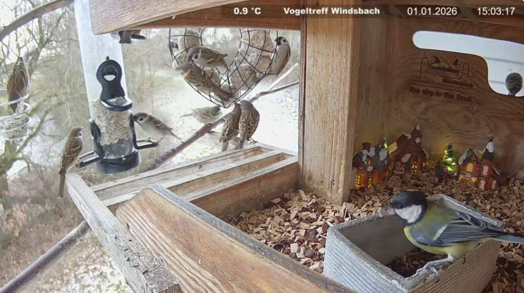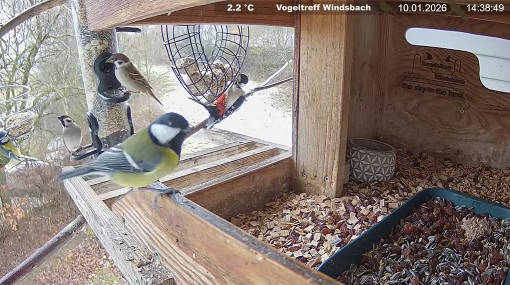 Viel Betrieb am Futterplatz: Buntspecht, (Feld-) Spatzen, Kohlis und Blauis.