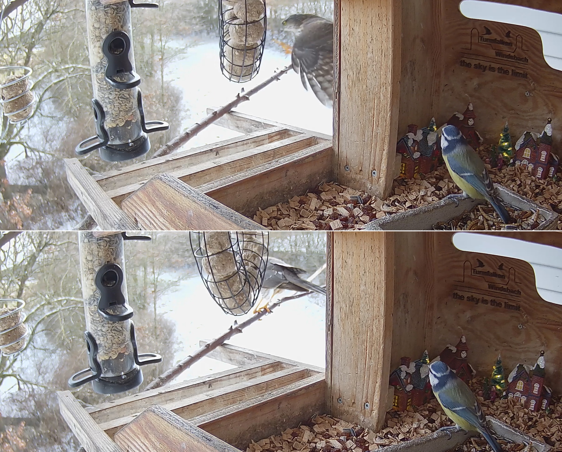 Die Blaumeise hier auf dem Bild wird das Sperber Erlebnis wahrscheinlich in beide Kategorien einsortieren können.