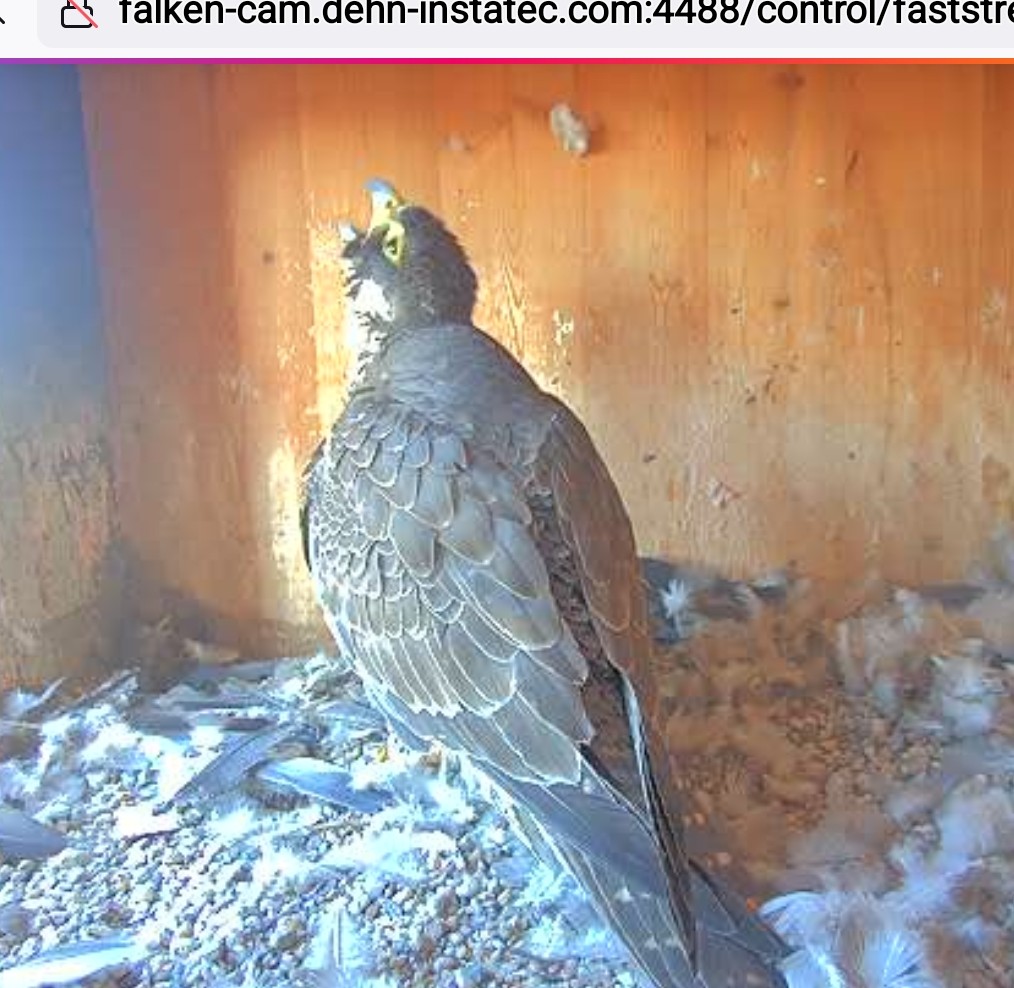 8.45 Uhr, Liesl bei ihrer Morgentoilette… sie reckt zwischendurch ihren Kopf hoch und sperrt den Schnabel weit auf… will sie einen Speiballen hochwürgen…? Dieses Verhalten habe ich auch schon bei den Jungfalken in Nürnberg beobachtet, bin mir aber über den Zweck dieser Übung nicht sicher… weiß einer der Foris etwas näheres dazu ?