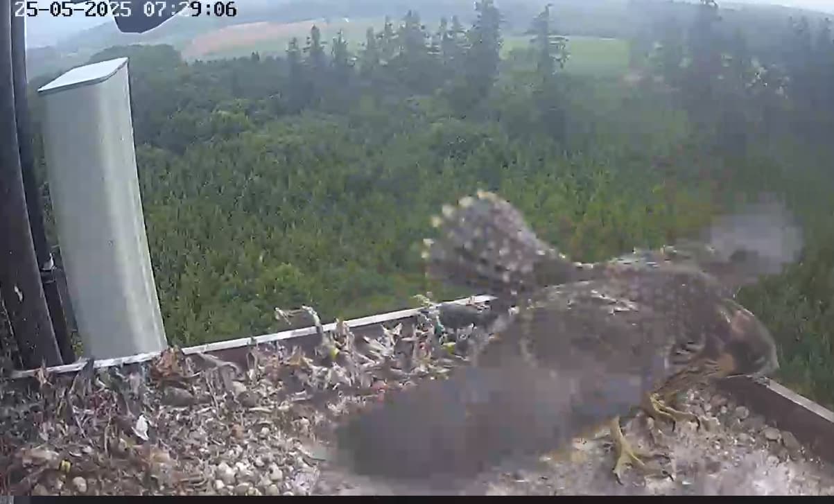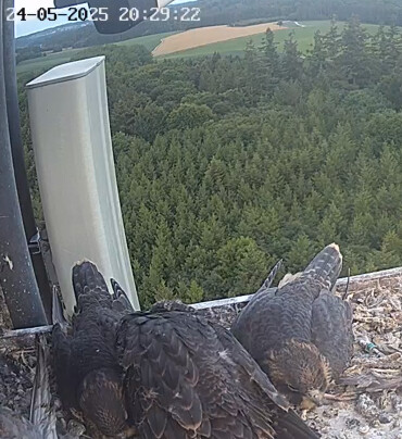 Um 21:00 Uhr macht Freddy den Abflug, und ein paar Sekunden später landet ein Altvogel auf der Plattform, ich glaube, es ist Frieda.
