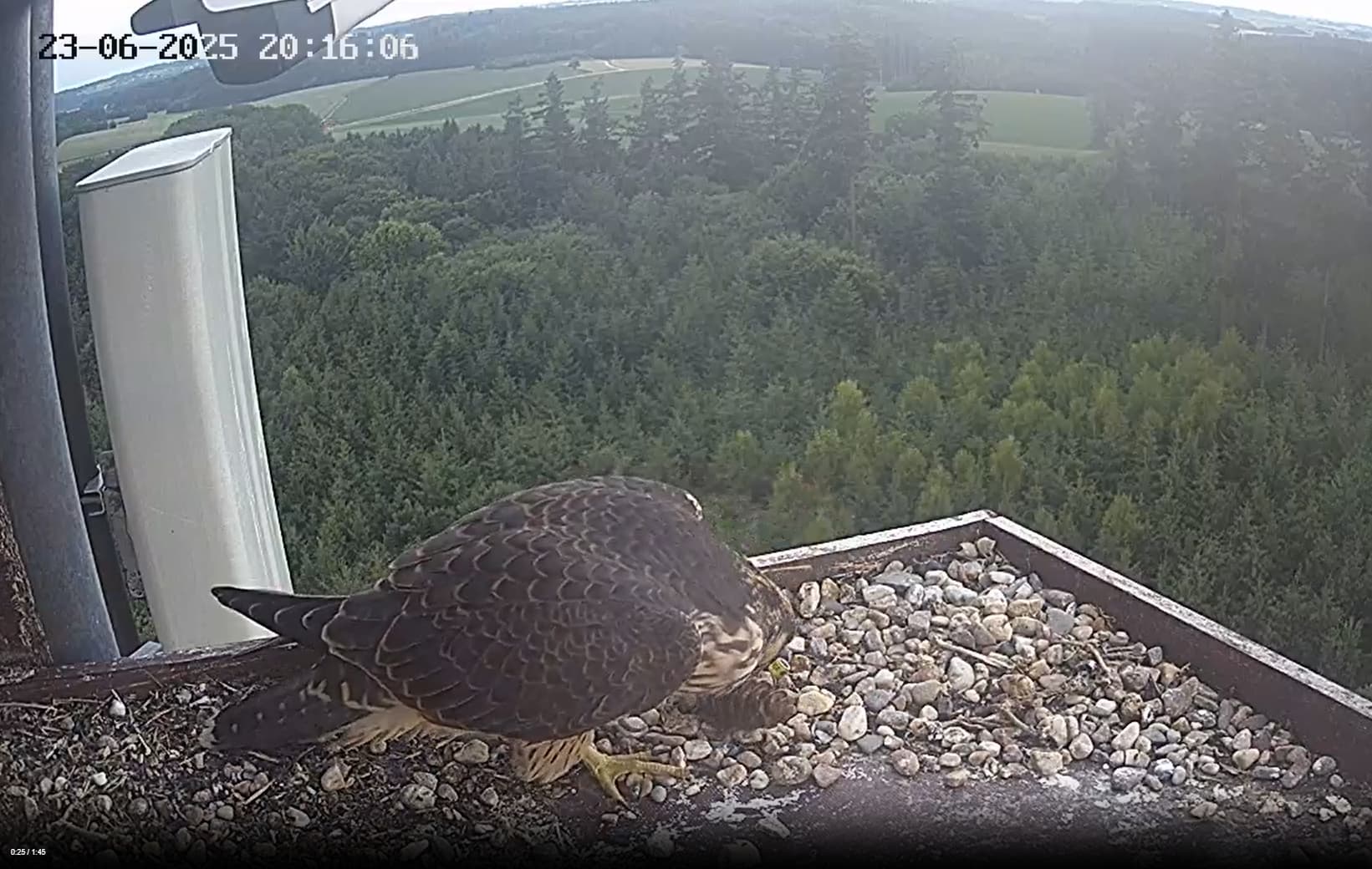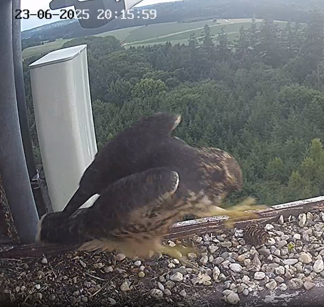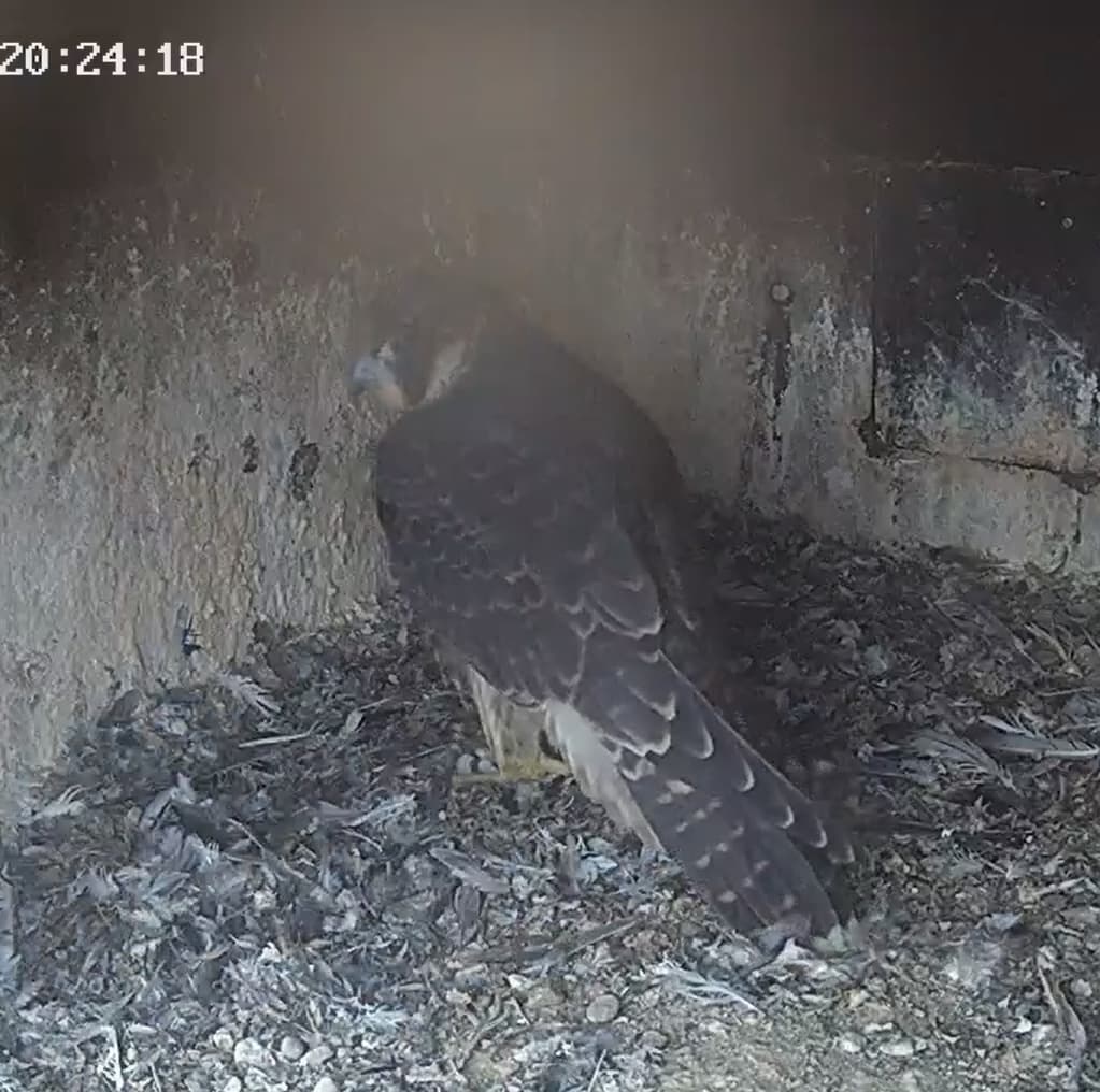 Einer der Jungfalken beim Dinner in der Abendsonne auf dem Balkon. Der Größe nach schätze ich, die junge Dame.