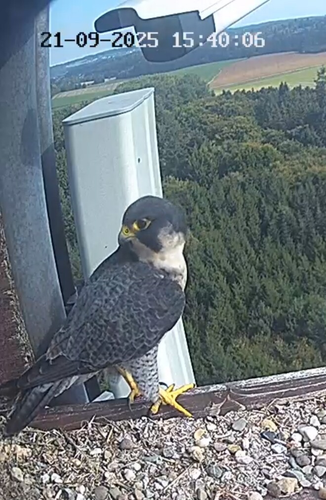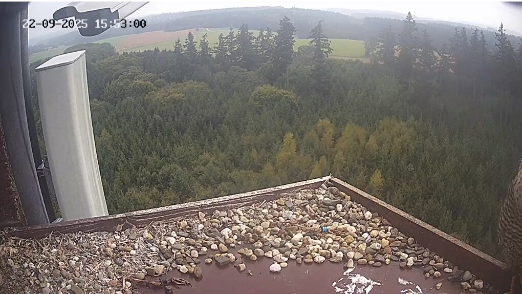 11:04 Frieda (denke ich wegen des Brustgefieders, man sieht nur ganz wenig) sitzt ganz rechts am Bildrand, Außencam.