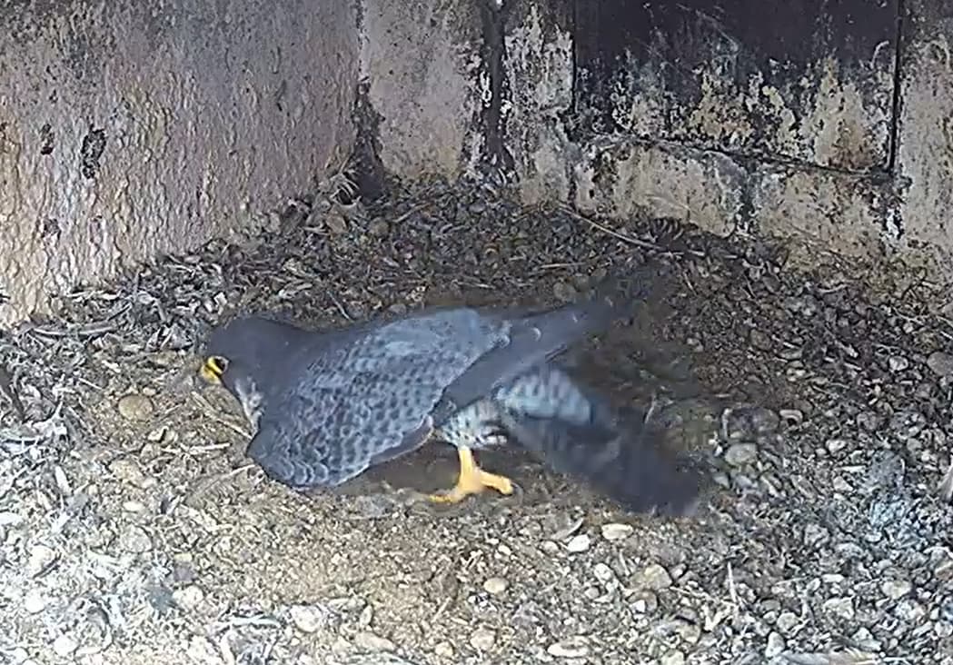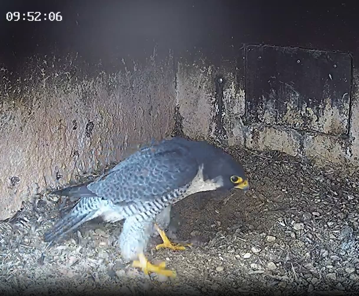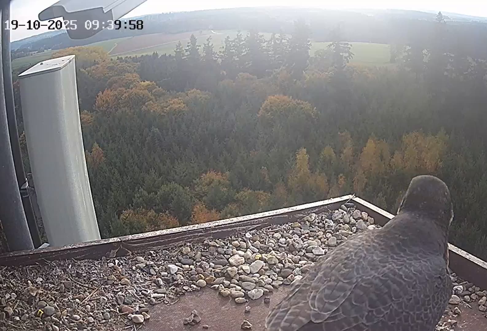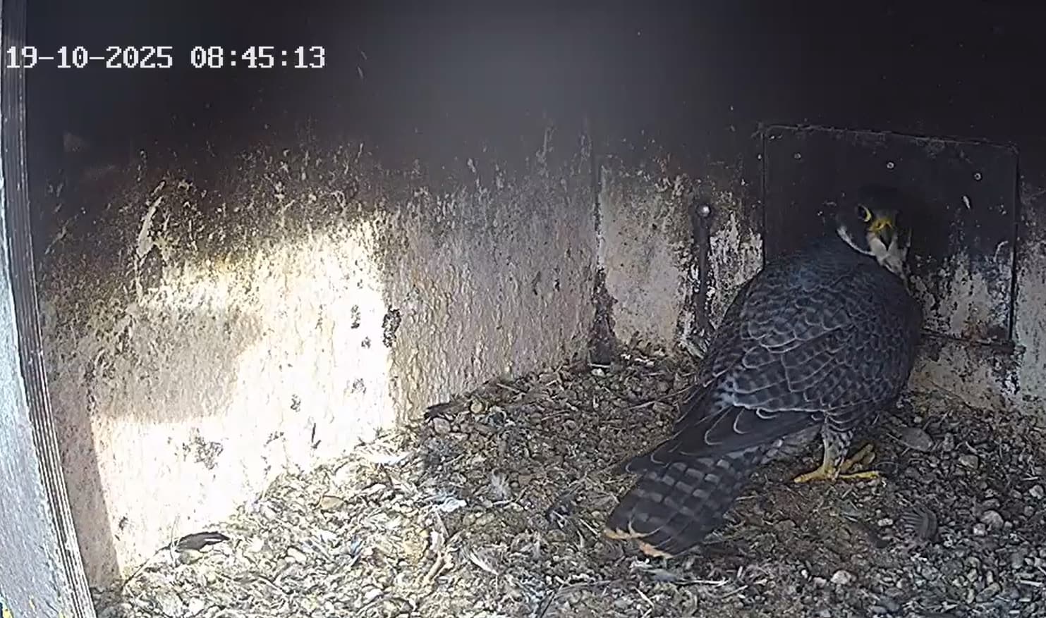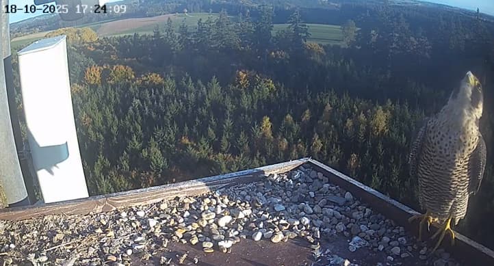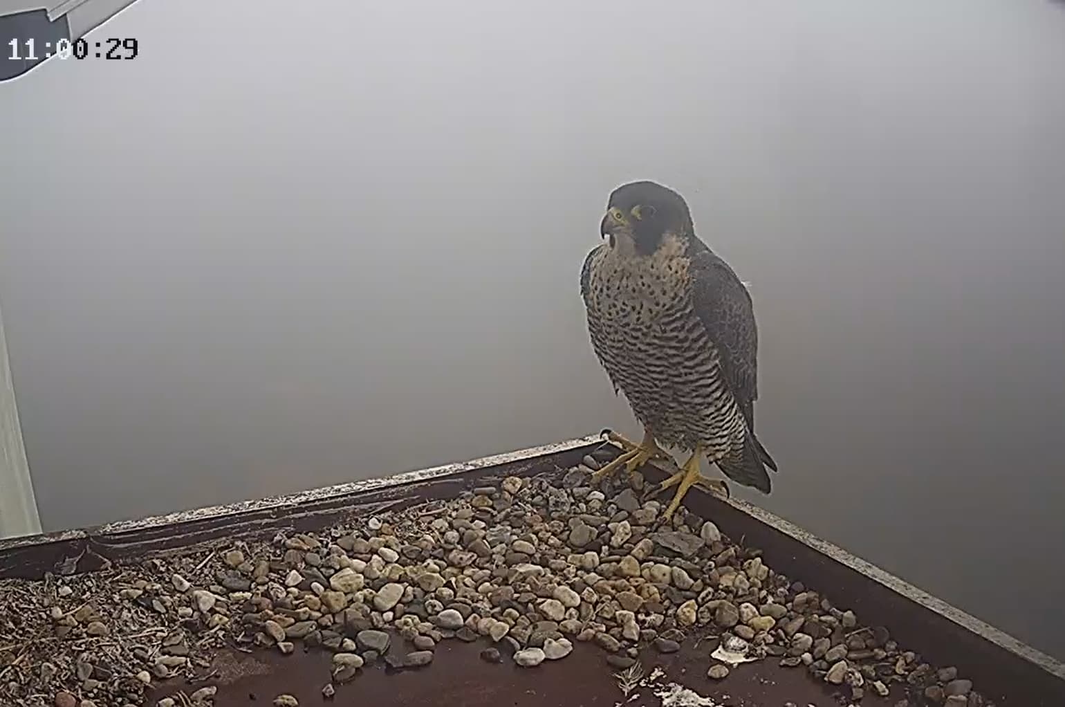 Wie gestern sitzt heute lange ein Wanderfalke auf der Plattform. Ich glaube, es ist Frieda, hab aber nicht beobachtet, wie sie rübergeflogen ist, von daher bin ich nicht sicher.