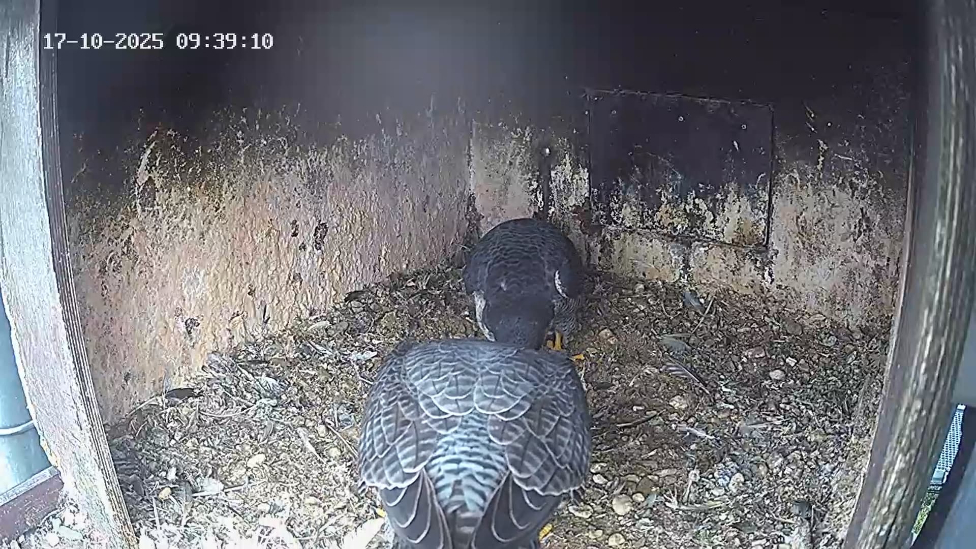 Ich finde es sehr witzig, dass die beiden bei den Bondings eigentlich immer die gleichen Positionen einnehmen: Freddy mehr oder weniger in der Nistmulde, Frieda rennt immer hinten rechts in die Ecke. Zumindest in den letzten Tagen war das so.