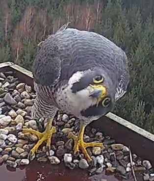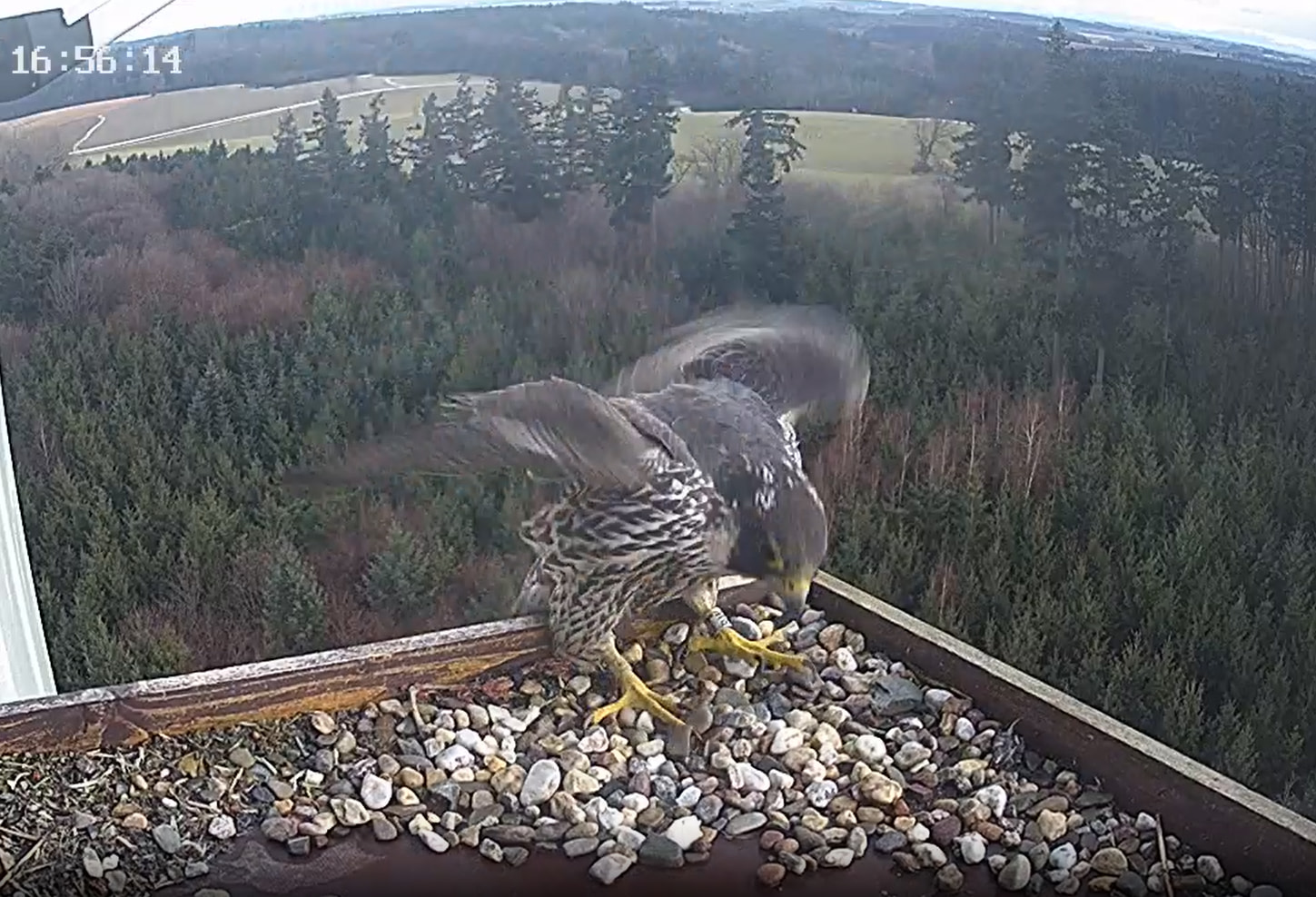 Mir scheint, die Jungfalkin sieht den Kasten nicht als mögliche Brutstätte, sondern als Futterlager bzw -Versorgung, denn eben war sie schon wieder da, hat kurz reingeschaut und weiter gings
