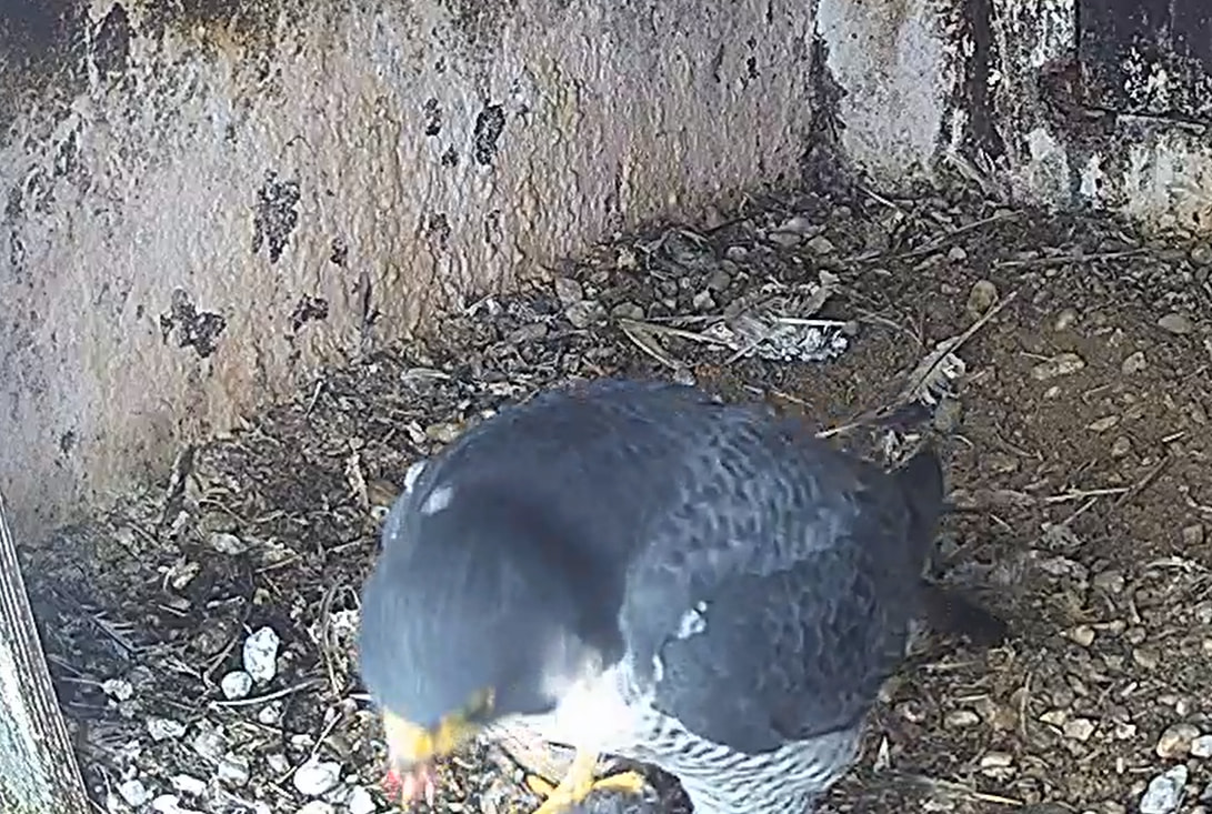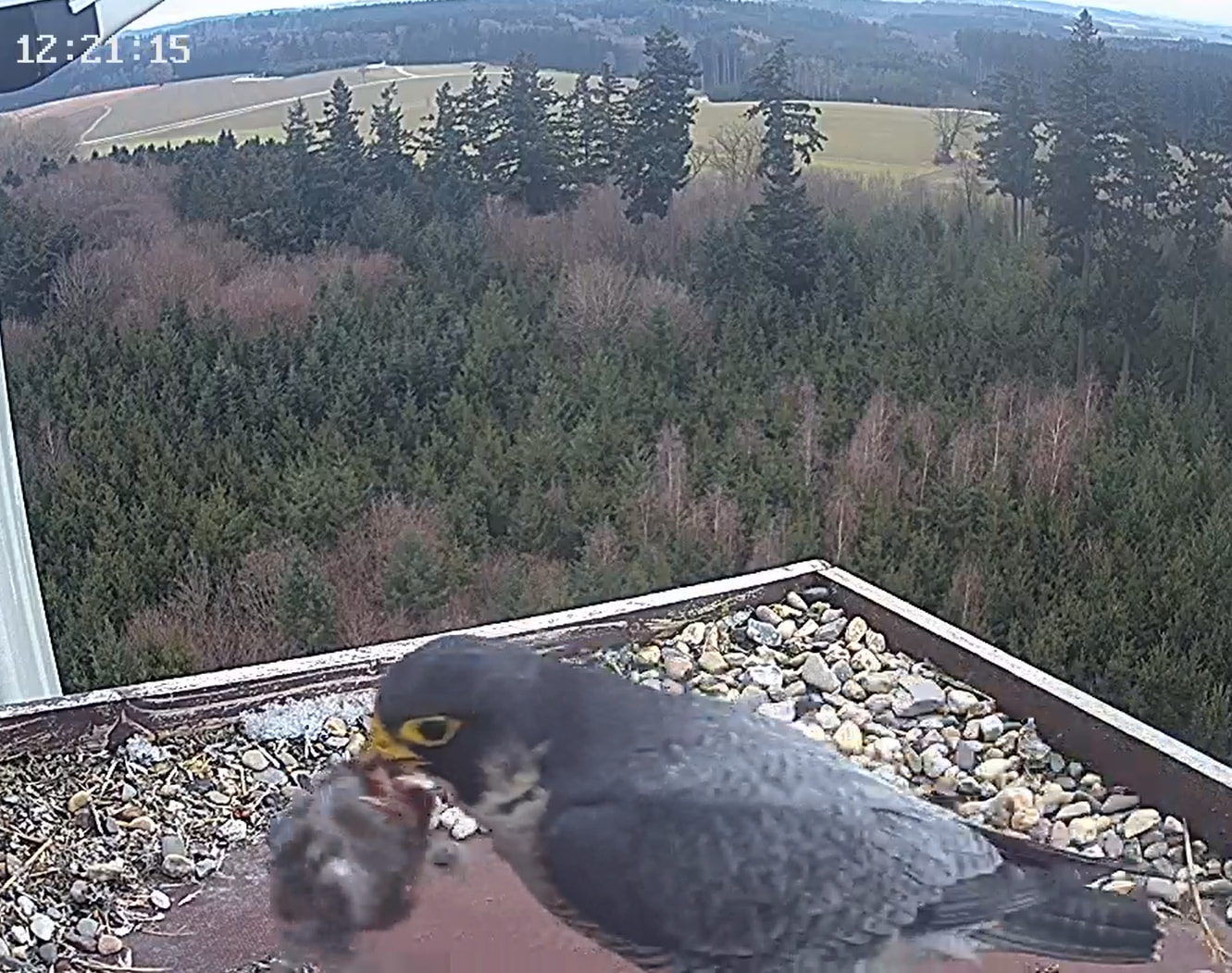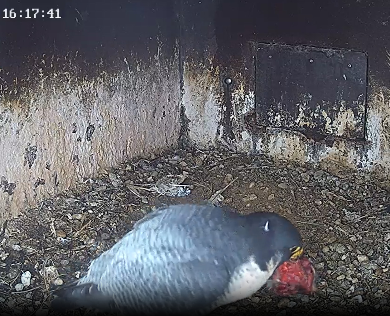 Ja, ich konnte auch keins sehen. Aber Freddy war gegen 17 Uhr für ein paar Minuten im Kasten, da ging die Kamera noch nicht, und als er wieder rauskam, hat er Schnabel und Krallen gesäubert. Ich vermute, er hat es sich selbst einverleibt…