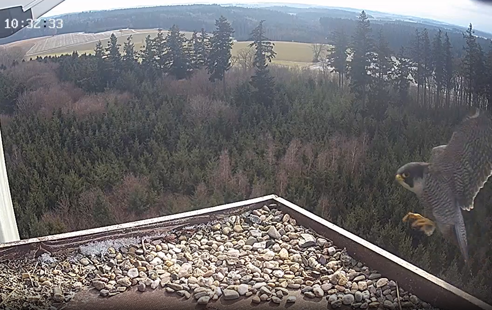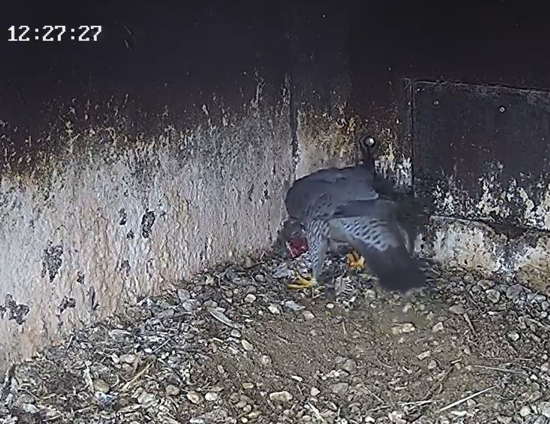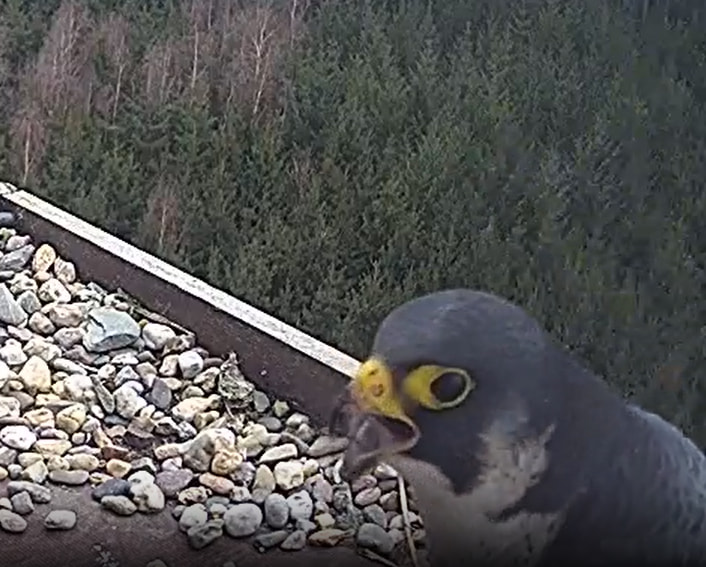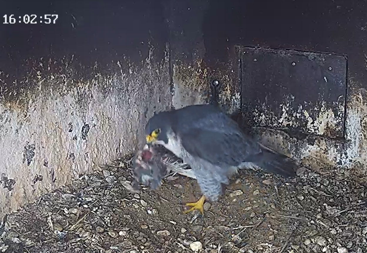 Ja, ich konnte auch keins sehen. Aber Freddy war gegen 17 Uhr für ein paar Minuten im Kasten, da ging die Kamera noch nicht, und als er wieder rauskam, hat er Schnabel und Krallen gesäubert. Ich vermute, er hat es sich selbst einverleibt…