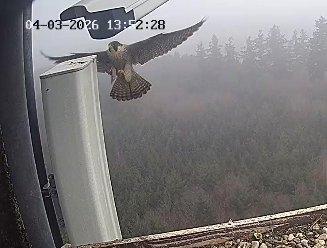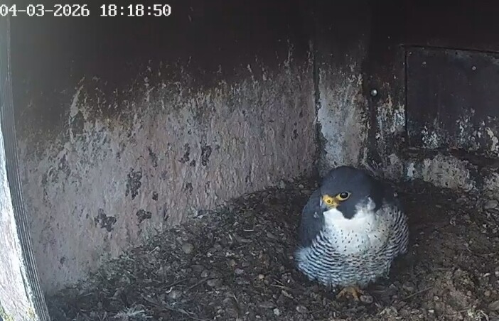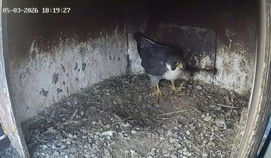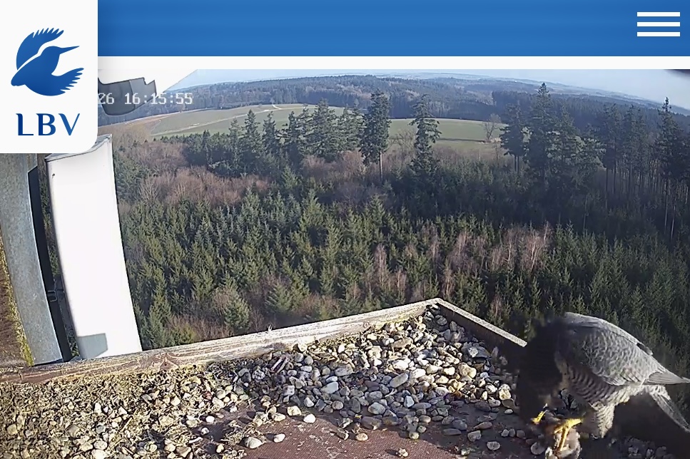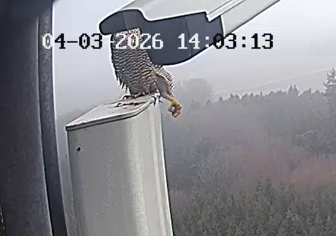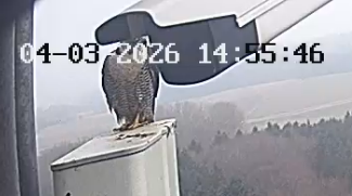 Es ist ein bisschen aufgeklart und ein Wanderfalke auf der Plattform gelandet