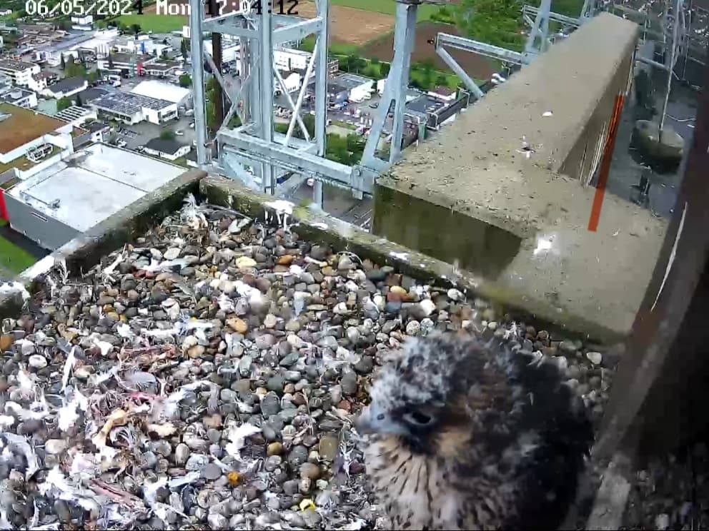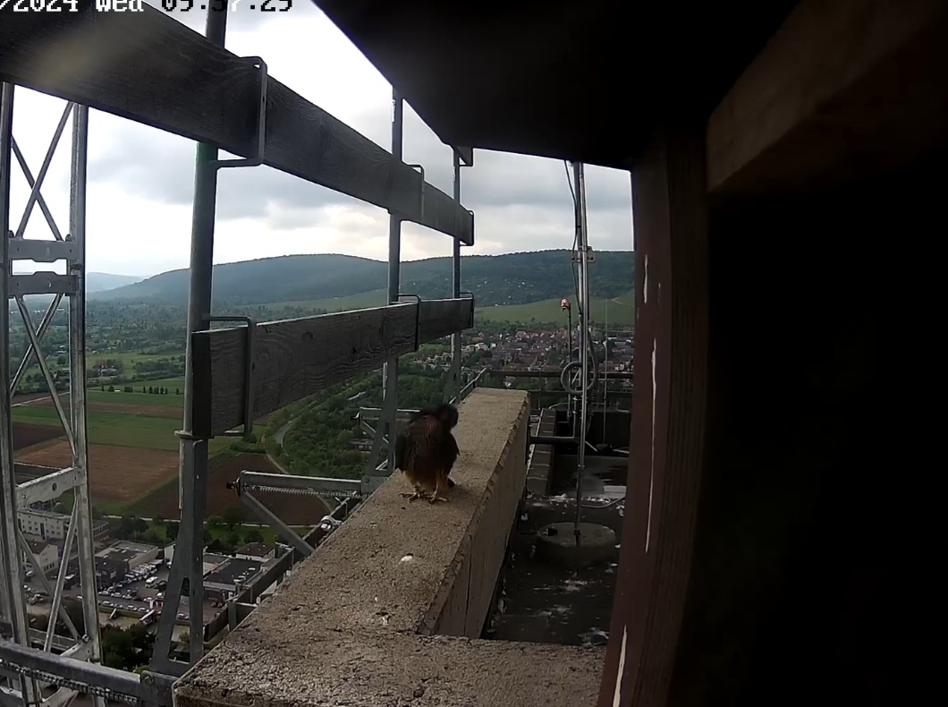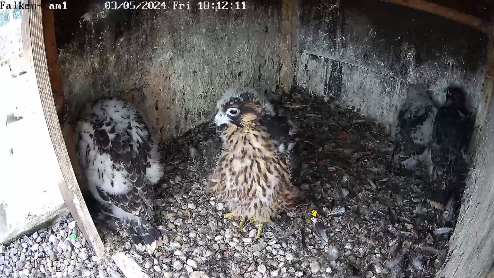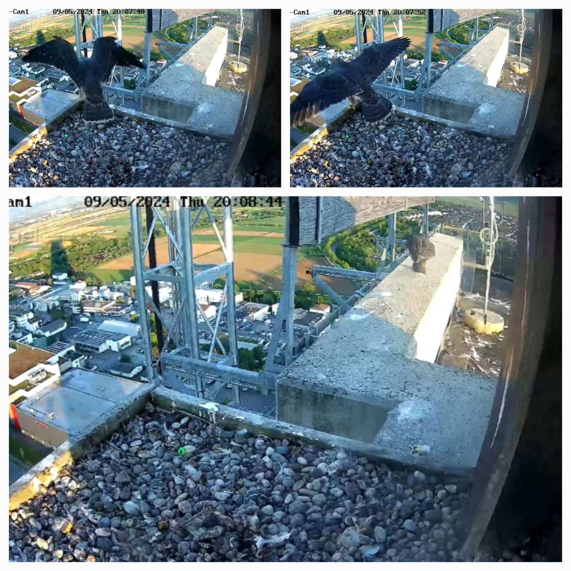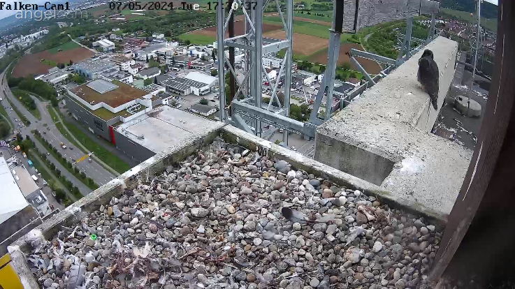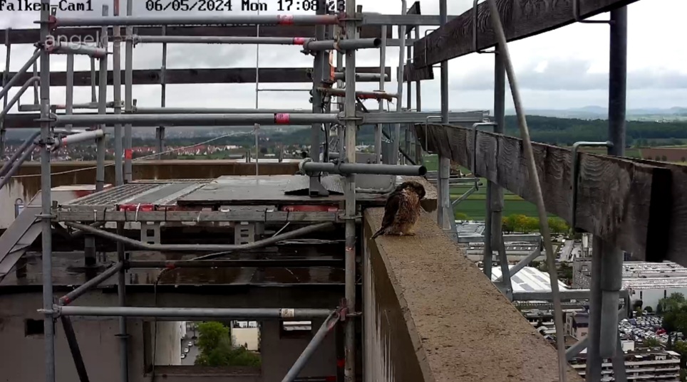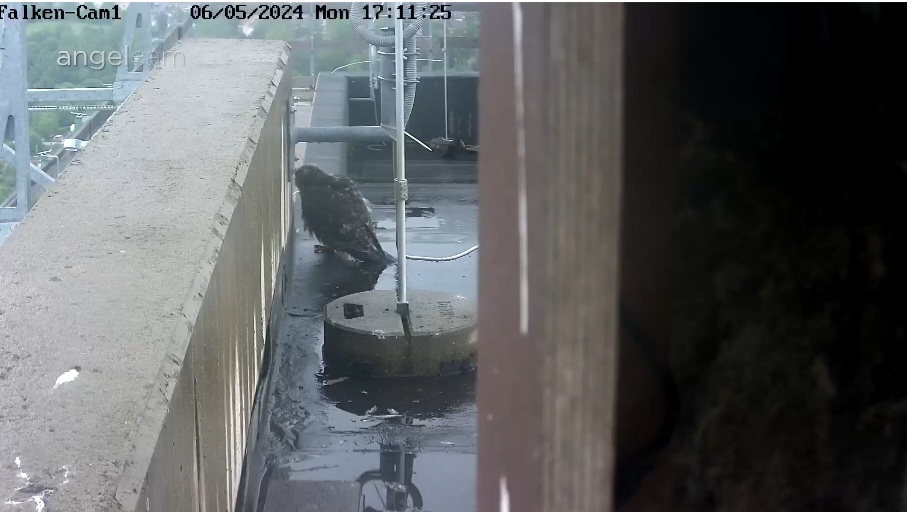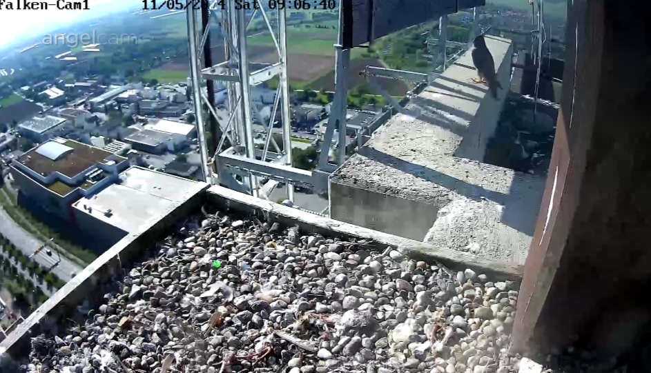 Seit 3 Tagen wurde 1 junger Falke nicht mehr vor der Kamera gesichtet. Davor war er auf das Dach darunter gehüpft.