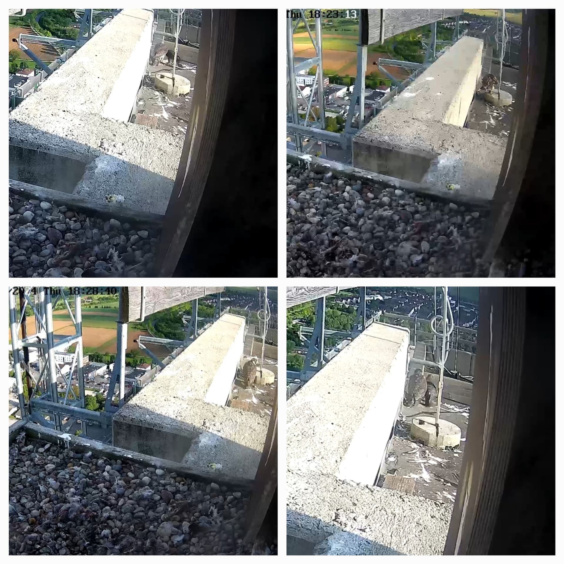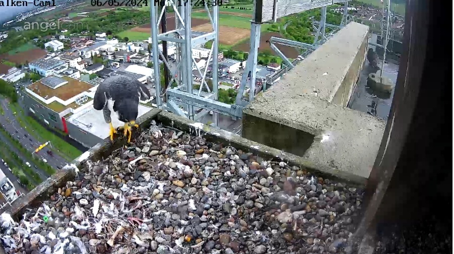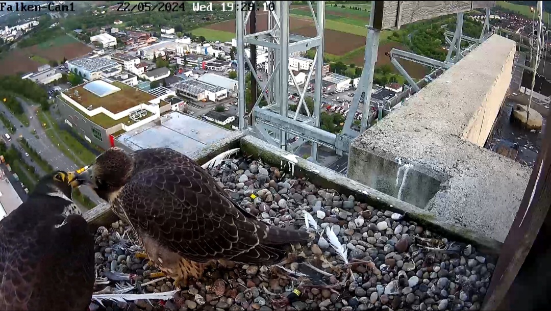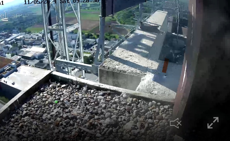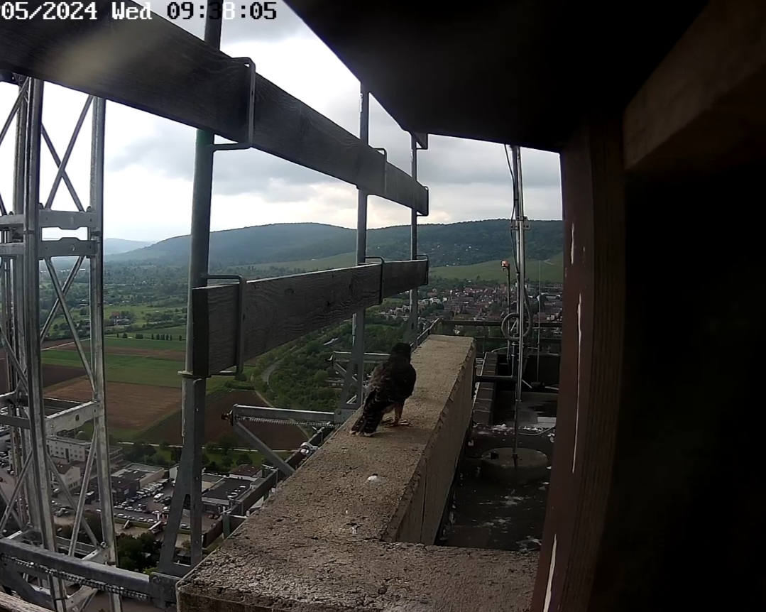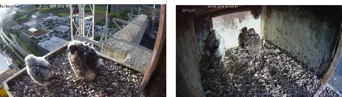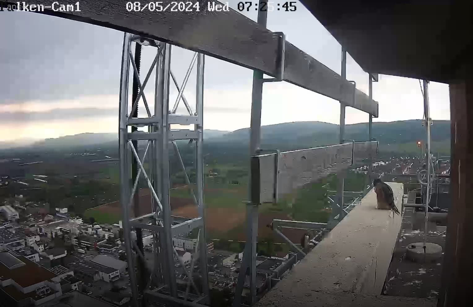 Seit 3 Tagen wurde 1 junger Falke nicht mehr vor der Kamera gesichtet. Davor war er auf das Dach darunter gehüpft.