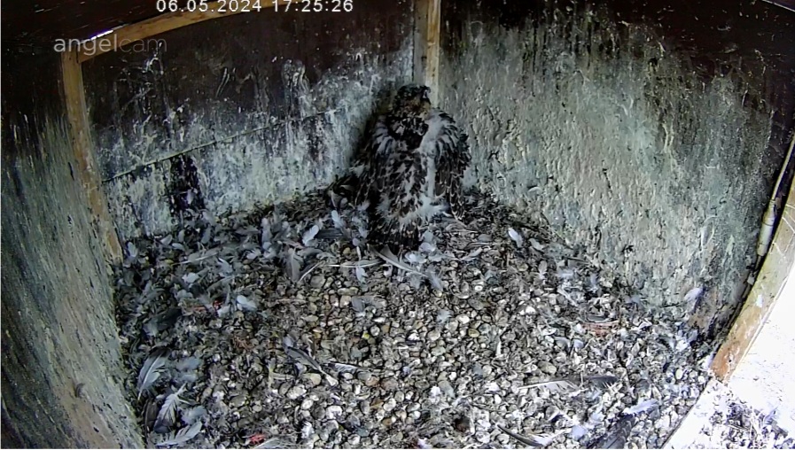 Vor ca. 30 Minuten ( 17 Uhr) saß wohl der Jungvogel fast schon ohne Flaum ganz hinten am Betonrand.