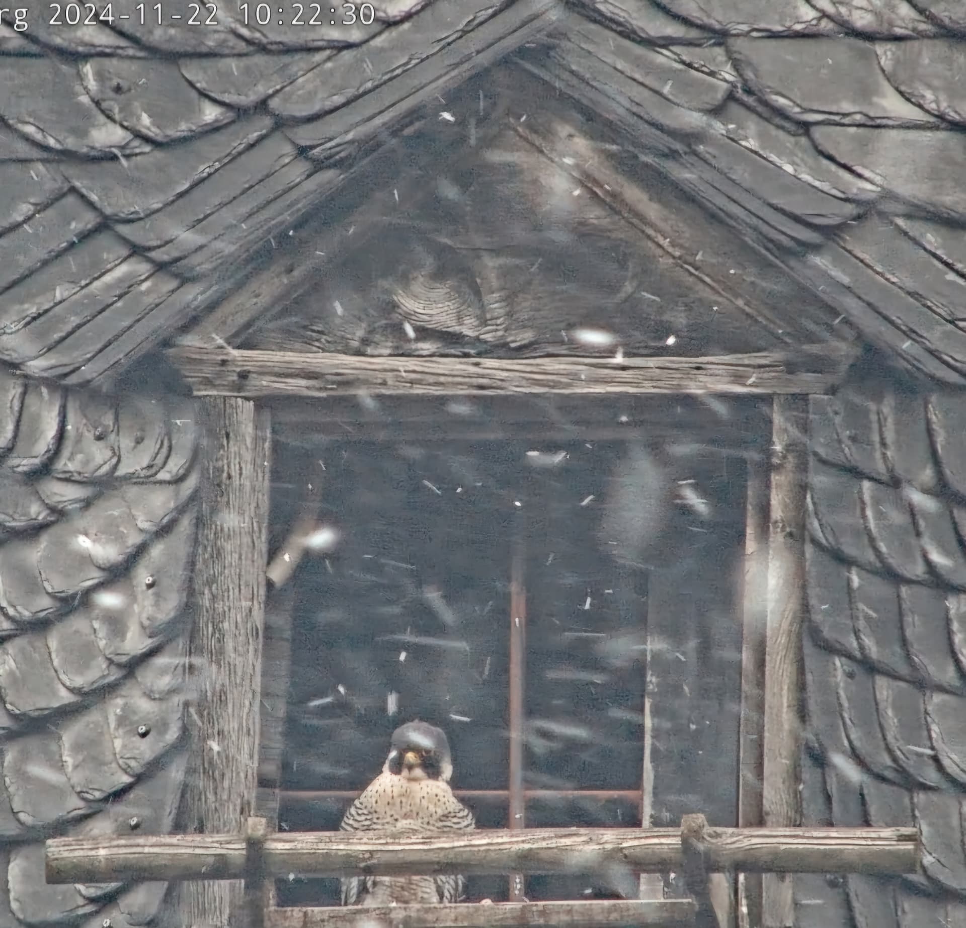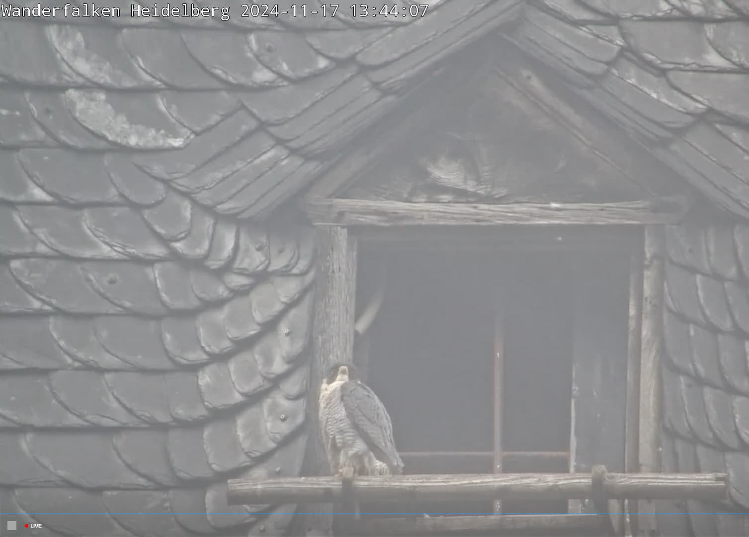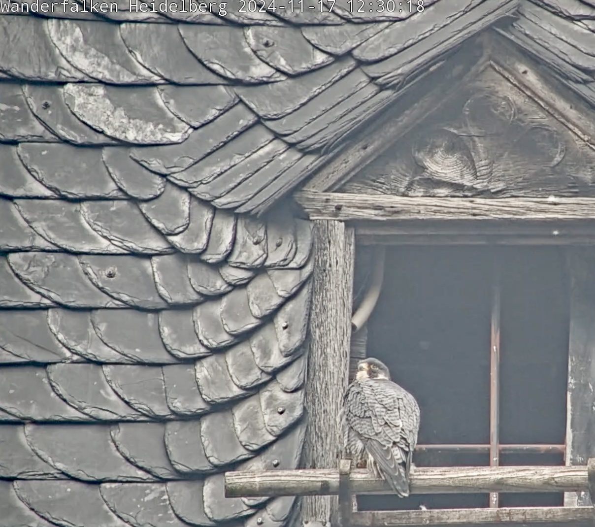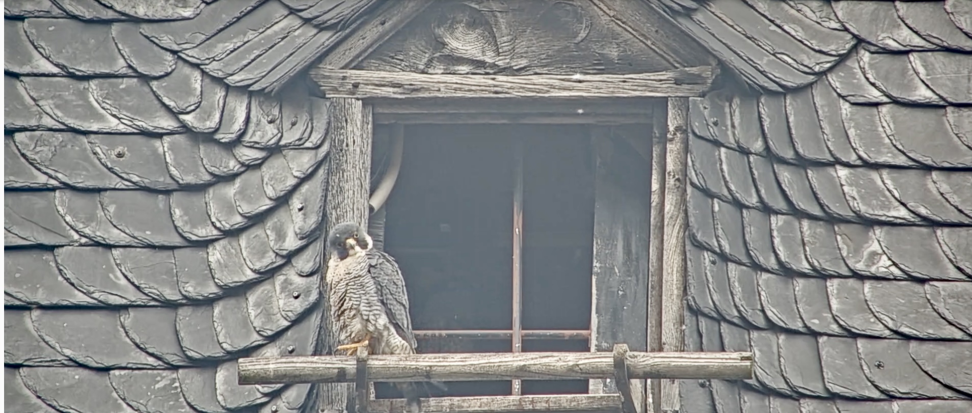 Wenn Falke auf der Abflugstange sitzt, einfach mal auf die Schindeln nebendran gucken, zählen und merken ![]()