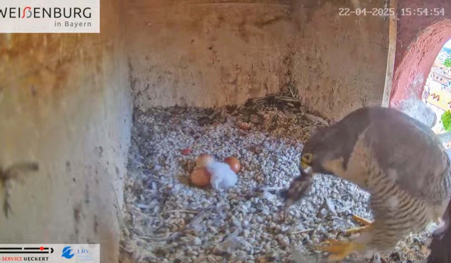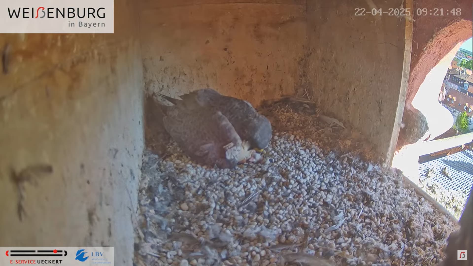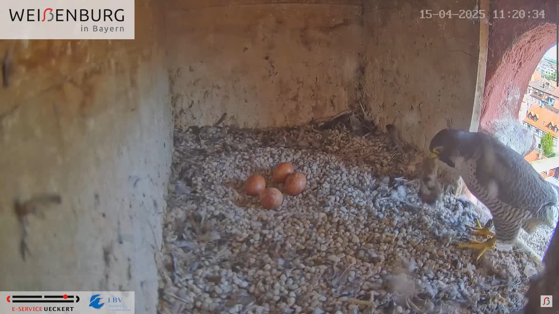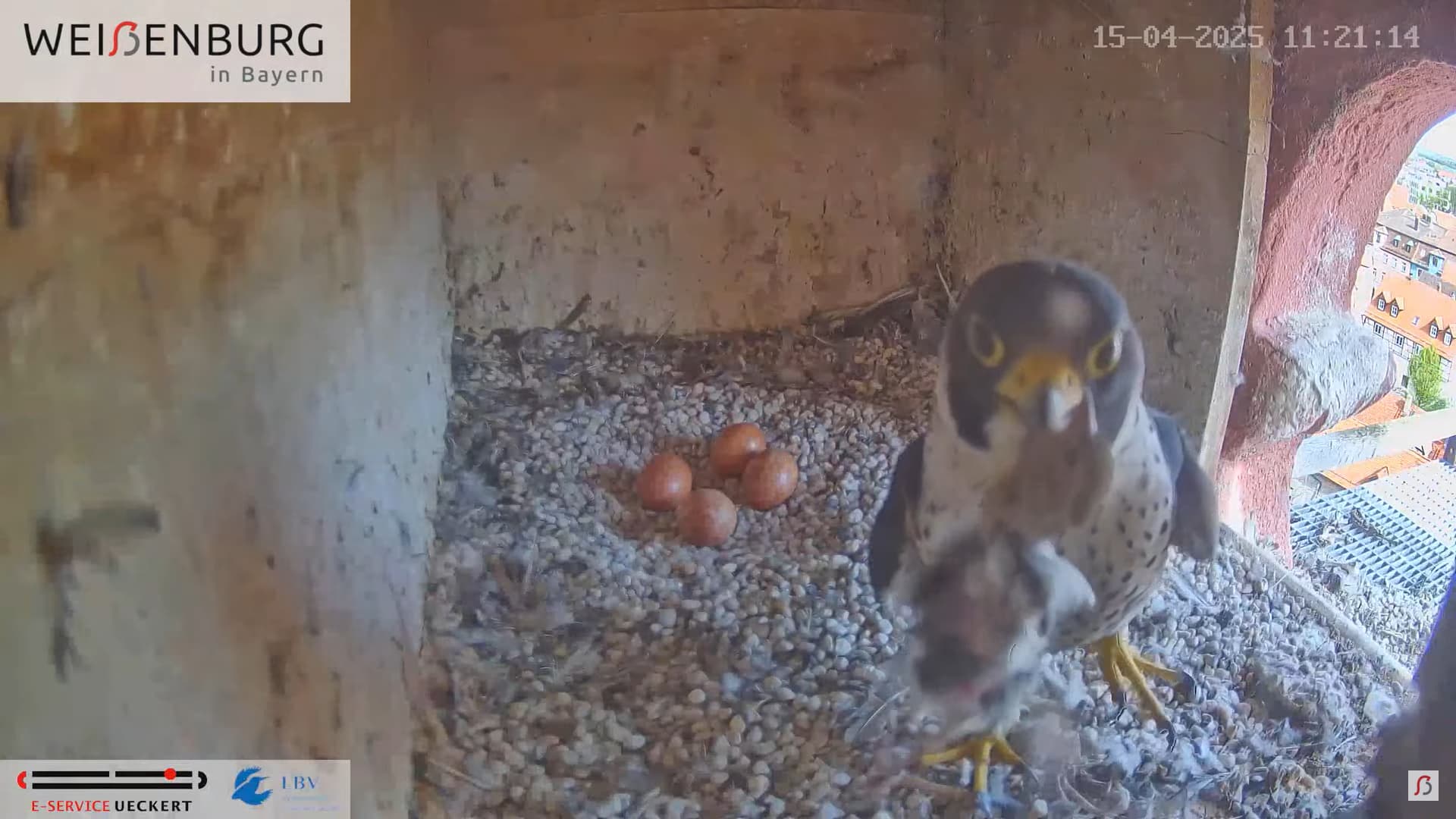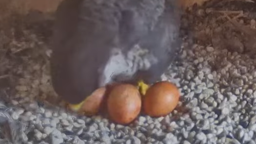 Alfredo landet gerade mit seiner Beute auf dem Balkönchen. Bella unterbricht das Brüten, greift sich die Beute und fliegt damit ab. Was Alfredo natürlich ausnützt und sich schleunigst auf die Eier niederlässt. Super Alfredo