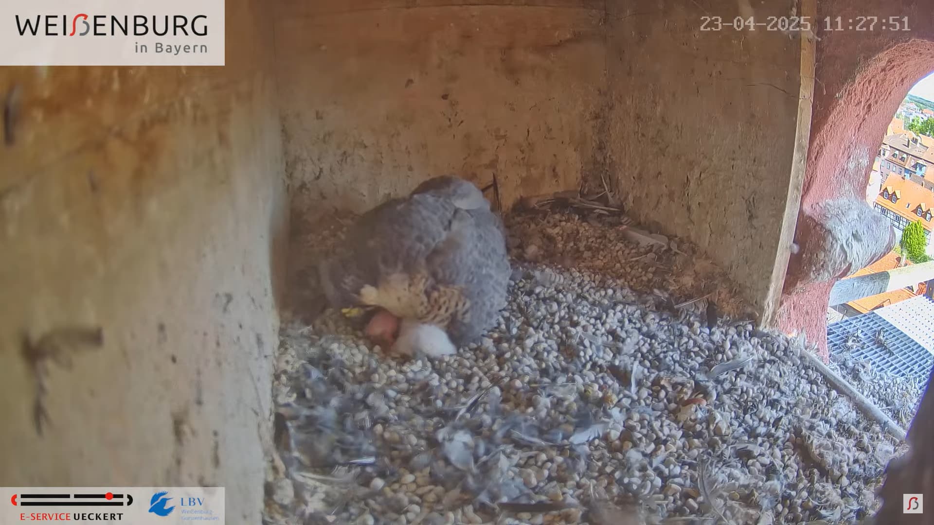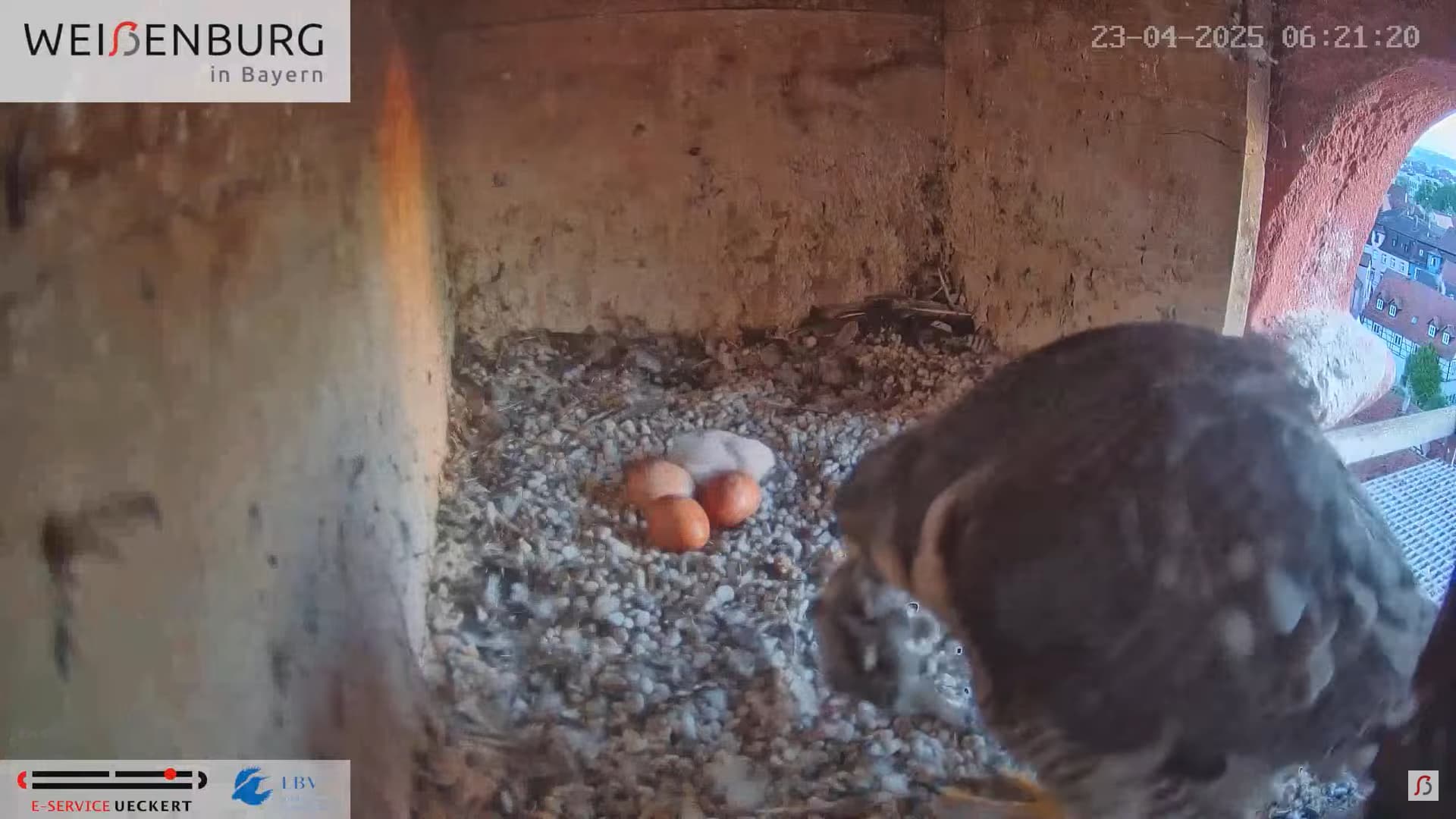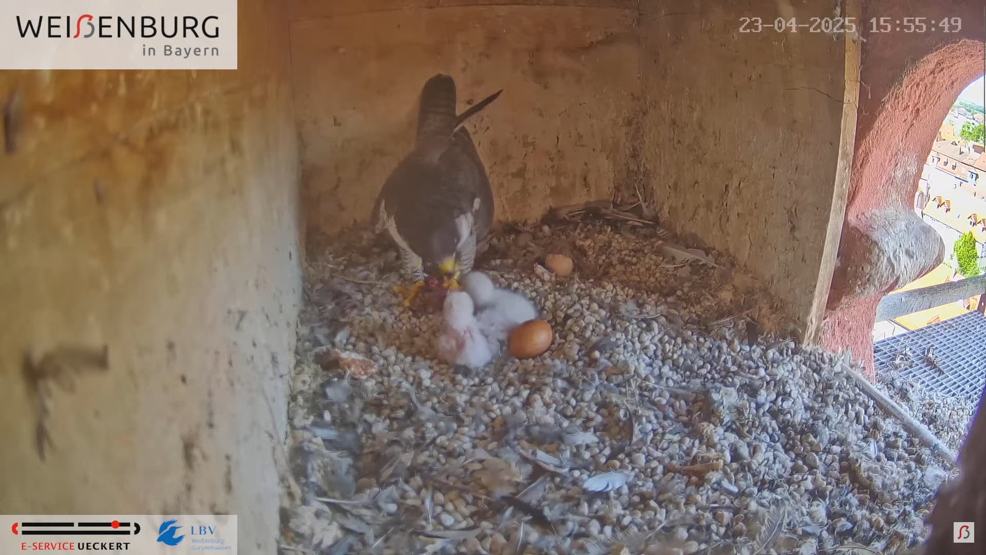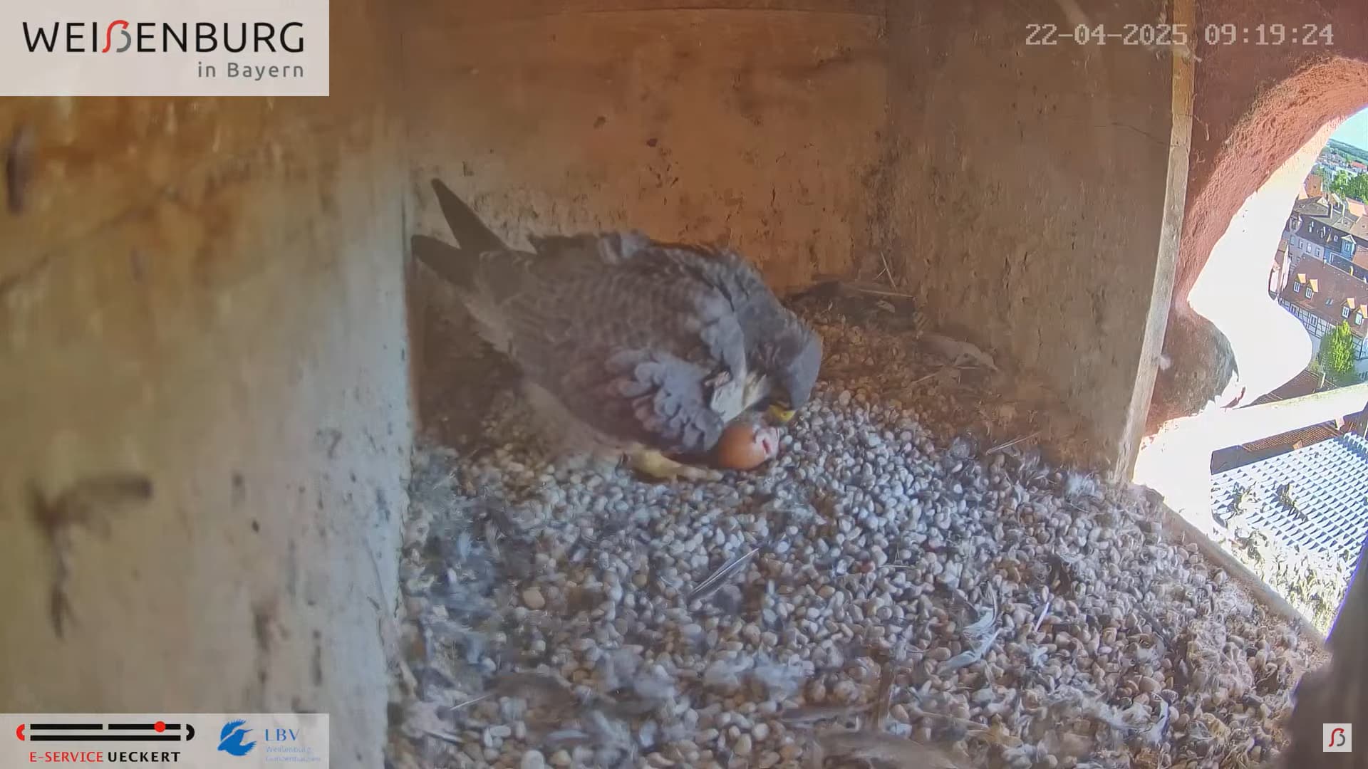 Alfredo landet gerade mit seiner Beute auf dem Balkönchen. Bella unterbricht das Brüten, greift sich die Beute und fliegt damit ab. Was Alfredo natürlich ausnützt und sich schleunigst auf die Eier niederlässt. Super Alfredo