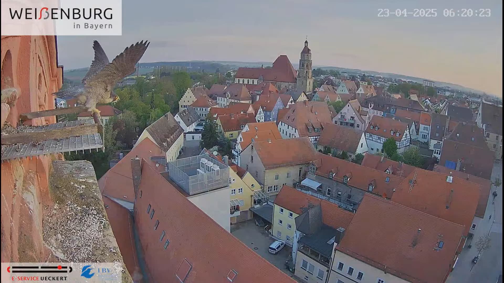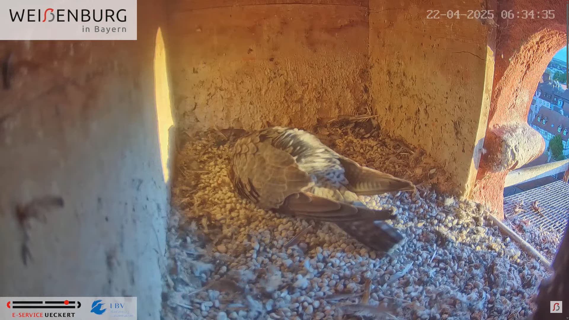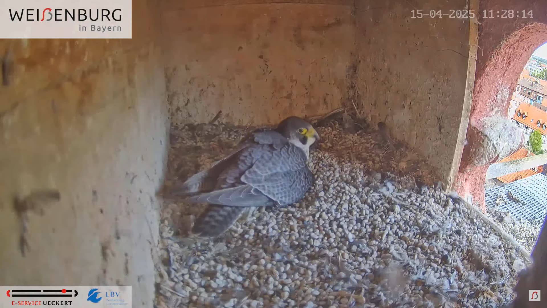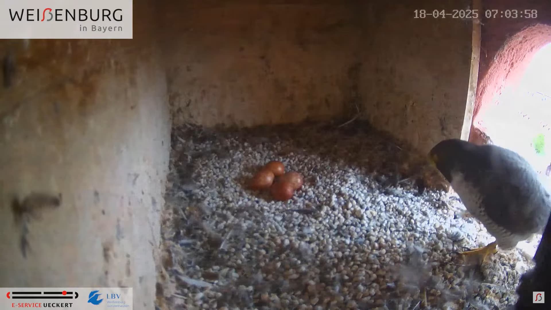 Alfredo landet gerade mit seiner Beute auf dem Balkönchen. Bella unterbricht das Brüten, greift sich die Beute und fliegt damit ab. Was Alfredo natürlich ausnützt und sich schleunigst auf die Eier niederlässt. Super Alfredo