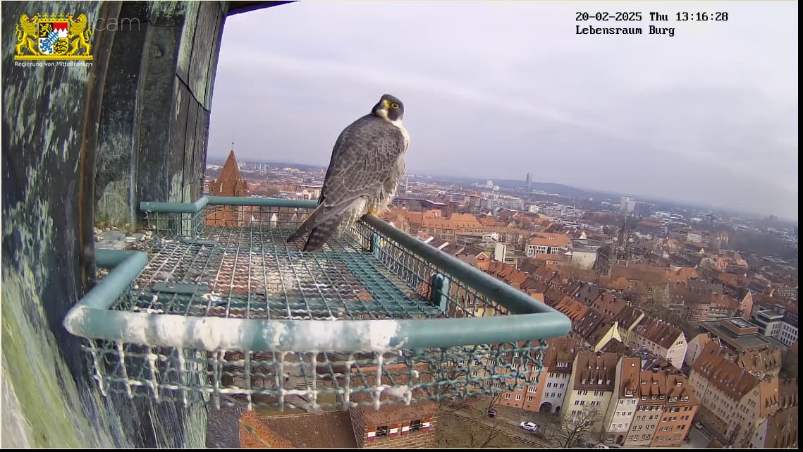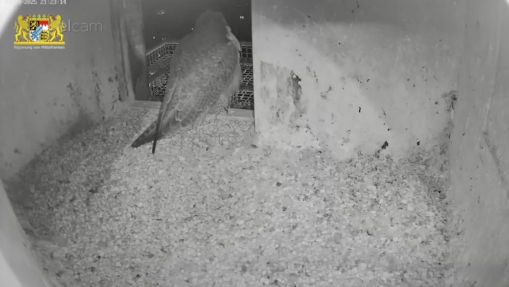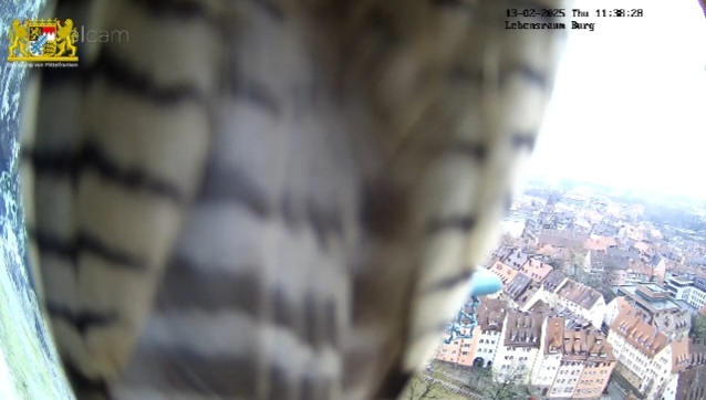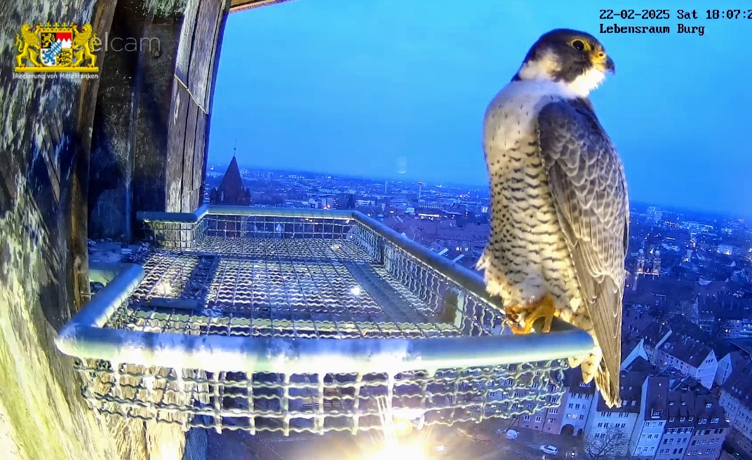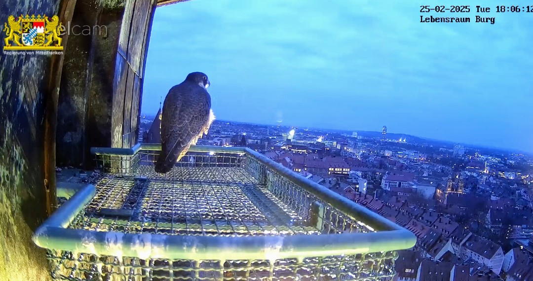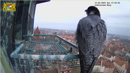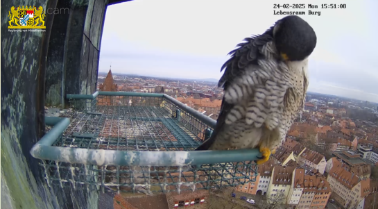 Ich hab mal in den Sichtungsmeldungen zurück gescrollt. Auf den Tag genau vor einem Jahr, am 25.02.24 wurde in den frühen Morgenstunden das erste Ei gelegt. Bisher war auch an den übrigen Brutplätzen, die wir hierzulande beobachten dürfen, meines Wissens noch keine Eiablage. Bei den Nürnberger Wanderfalken gab es in der letzten Zeit zahlreiche Sichtungen, sie kommen täglich mehrmals zum Brutplatz. Mit dem ersten Ei wird im Laufe dieser Woche gerechnet.
