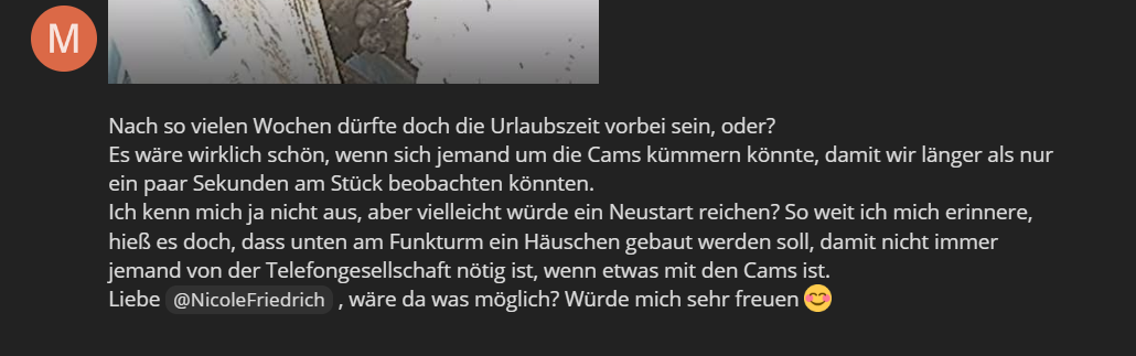 Leider sind die Kameras noch nicht wieder in Betrieb. Na wenigstens konnte ich gestern noch einen WF sehen ![]()