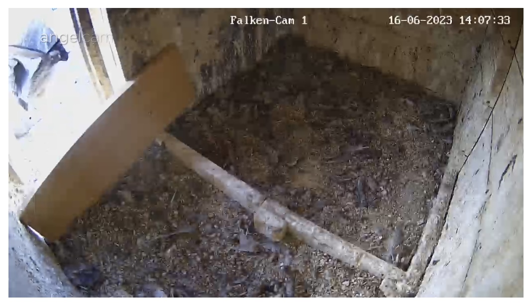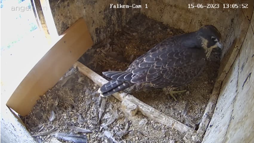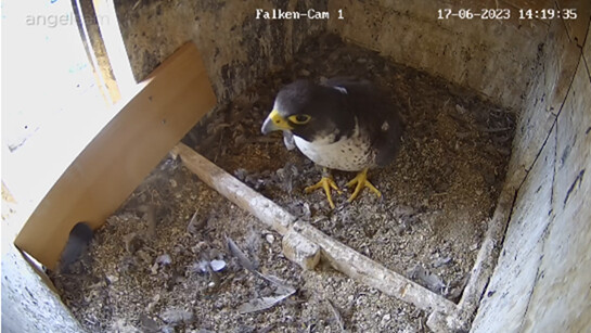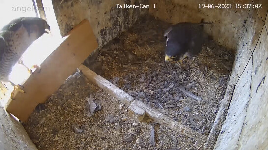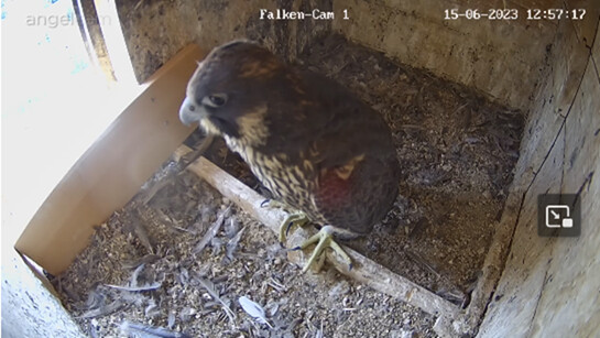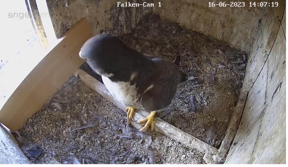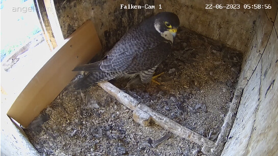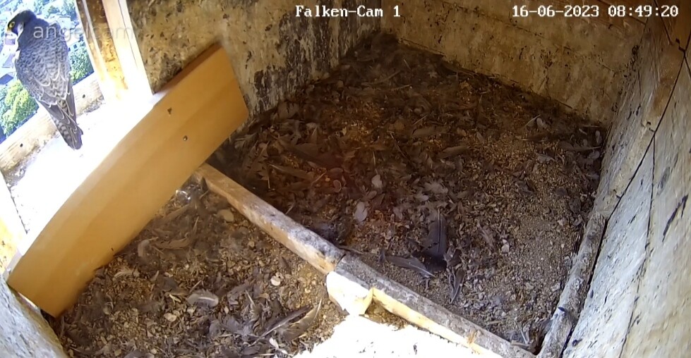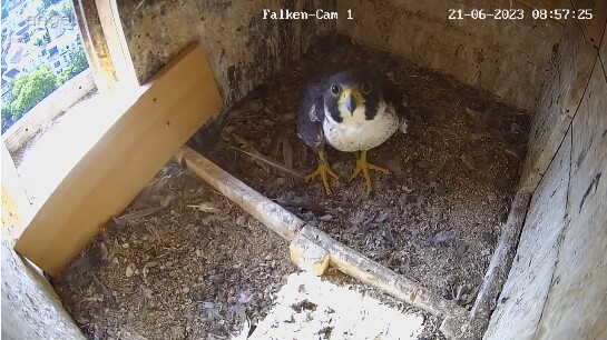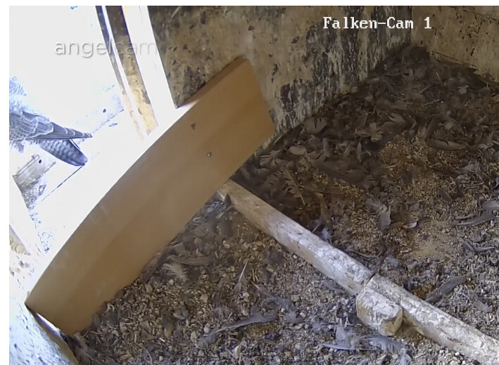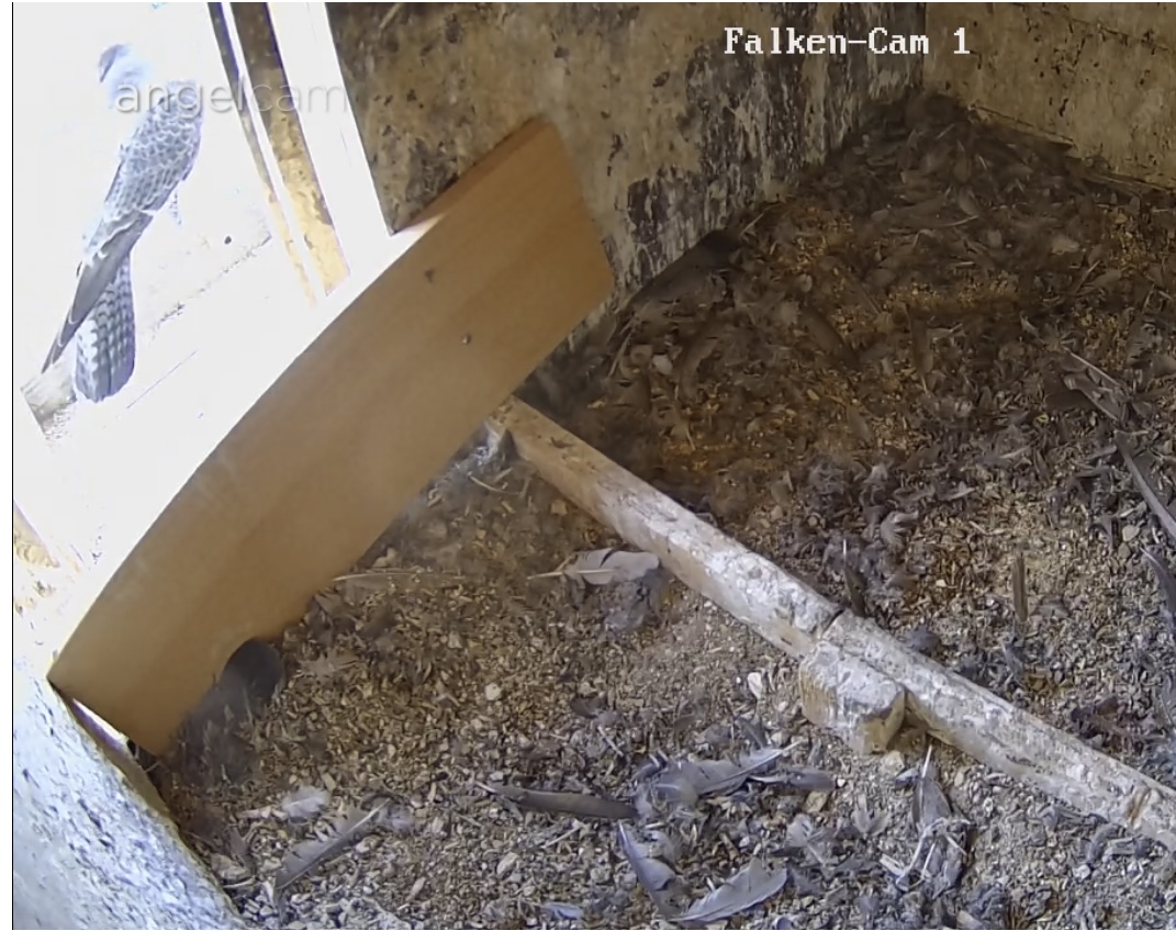 Guten Tag! Morgendlicher Hausbesuch; nach dem Abflug waren draußen mehrere Falken zu hören - ich glaube, dass Maxi dabei war. Das Futterbetteln klang nach ihr. Viele Grüße!