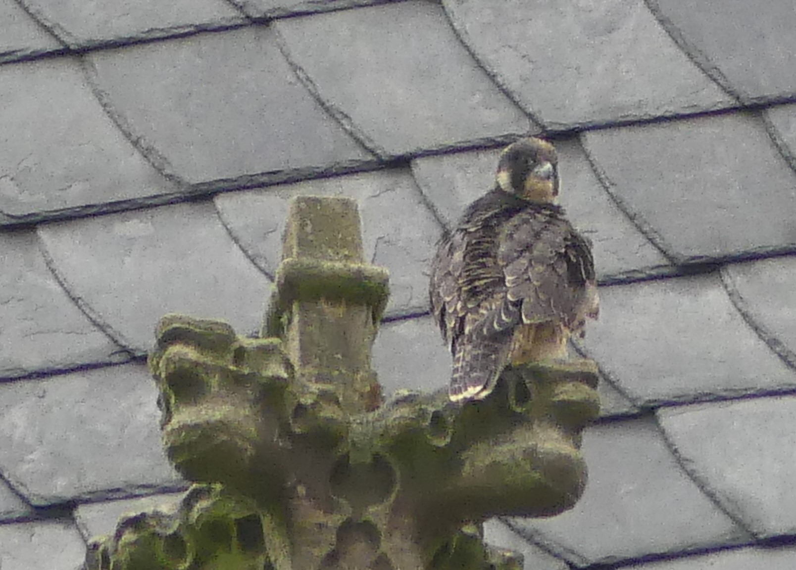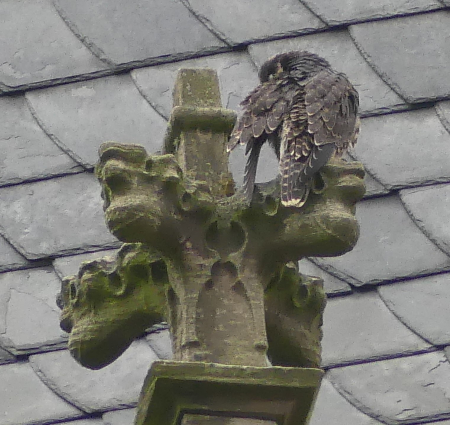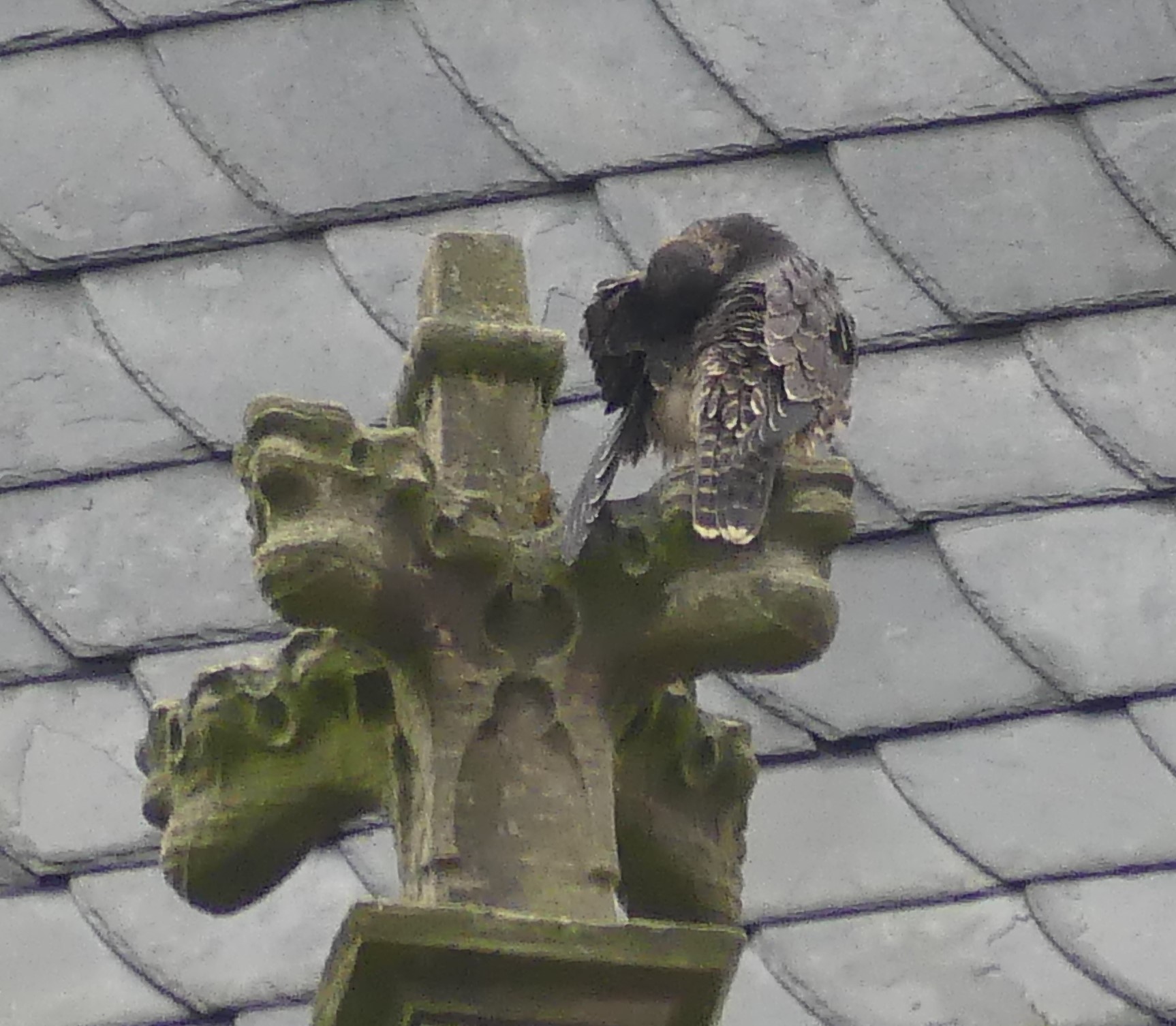 Hier ein paar Bilder von heute Abend - ausgiebige Gefiederpflege eines noch etwas durchfeuchteten Jungfalken (am weißen Schwanzende gut zu erkennen).