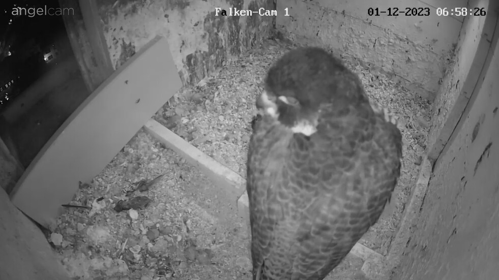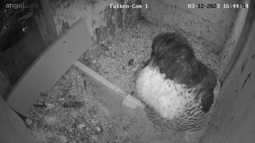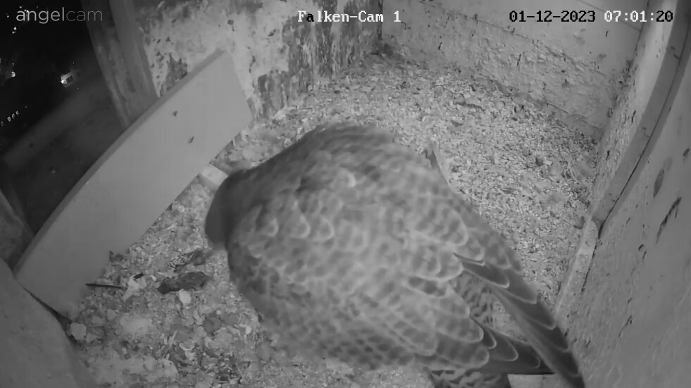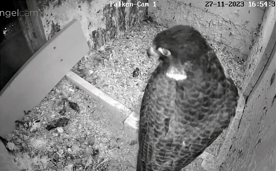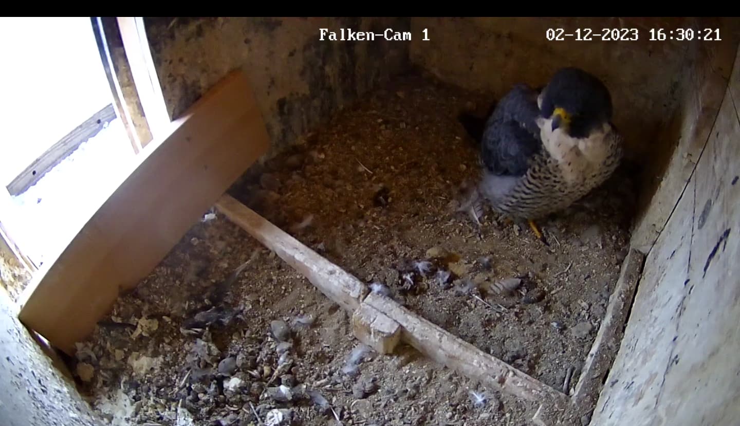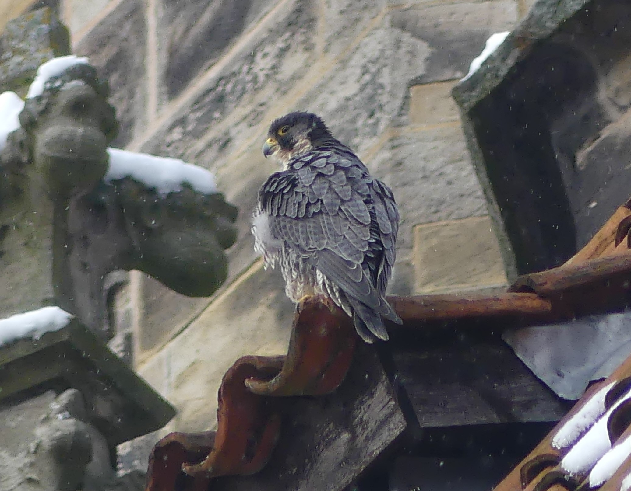 Auch unseren Morizfalken macht das Winterwetter offensichtlich gar nichts aus. Am Samstag vor dem 1. Advent saßen beide trotz Schneefall und eisigem Wind tiefenentspannt auf dem Dach der Kirche: